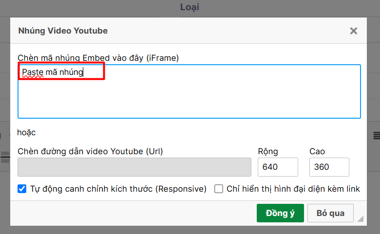 Nhập vào mục**"Chèn mã nhúng Embed" => Đồng ý.**
