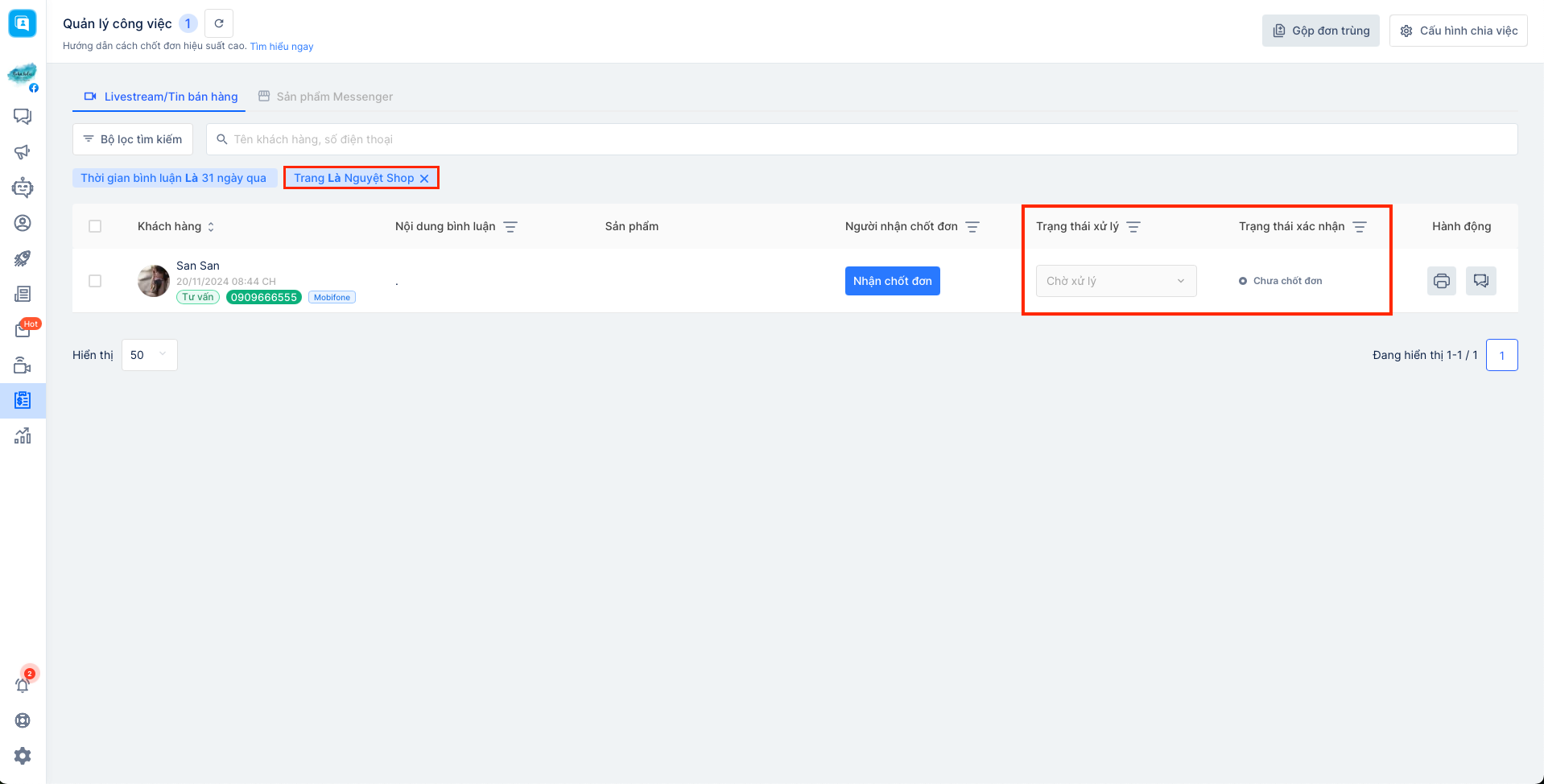 Khi đó hệ thống sẽ tự động chuyển đến trang công cụ Quản lý công việc, tại đây bạn sẽ xem được tổng quan tất cả bình luận cũng như trạng thái xác nhận đơn của các đơn đó: