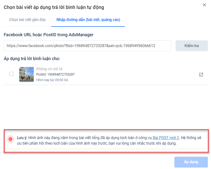 - Hiển thị thông báo hình ảnh bạn lựa chọn đã được áp dụng chung kịch bản phản hồi với bài viết tổng, bạn có thể cân nhắc trước khi áp dụng.