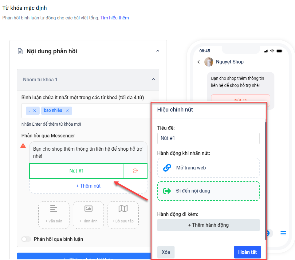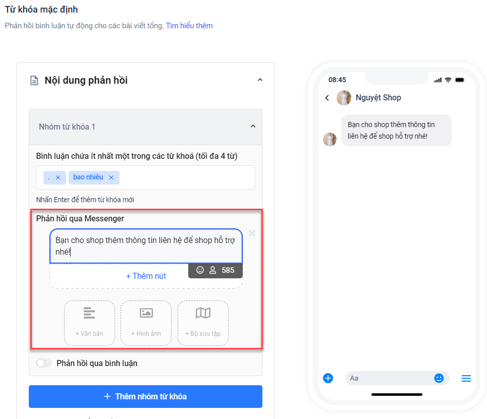 Tại đây bạn cần thiết lập các nhóm từ khóa mặc định, mỗi nhóm từ khóa sẽ tương ứng với các cách phản hồi khác nhau. Nói rõ hơn, mỗi nhóm từ khóa sẽ mang 1 nội dung khác nhau, ví dụ: nhóm về các trường hợp phê bình gồm các từ khóa như: dở, hư, xấu,... thì với những nhóm từ khóa này sẽ phản hồi với nội dung là xin lỗi. Từ khóa mặc định sẽ được áp dụng cho tất cả bài viết trên page của bạn.