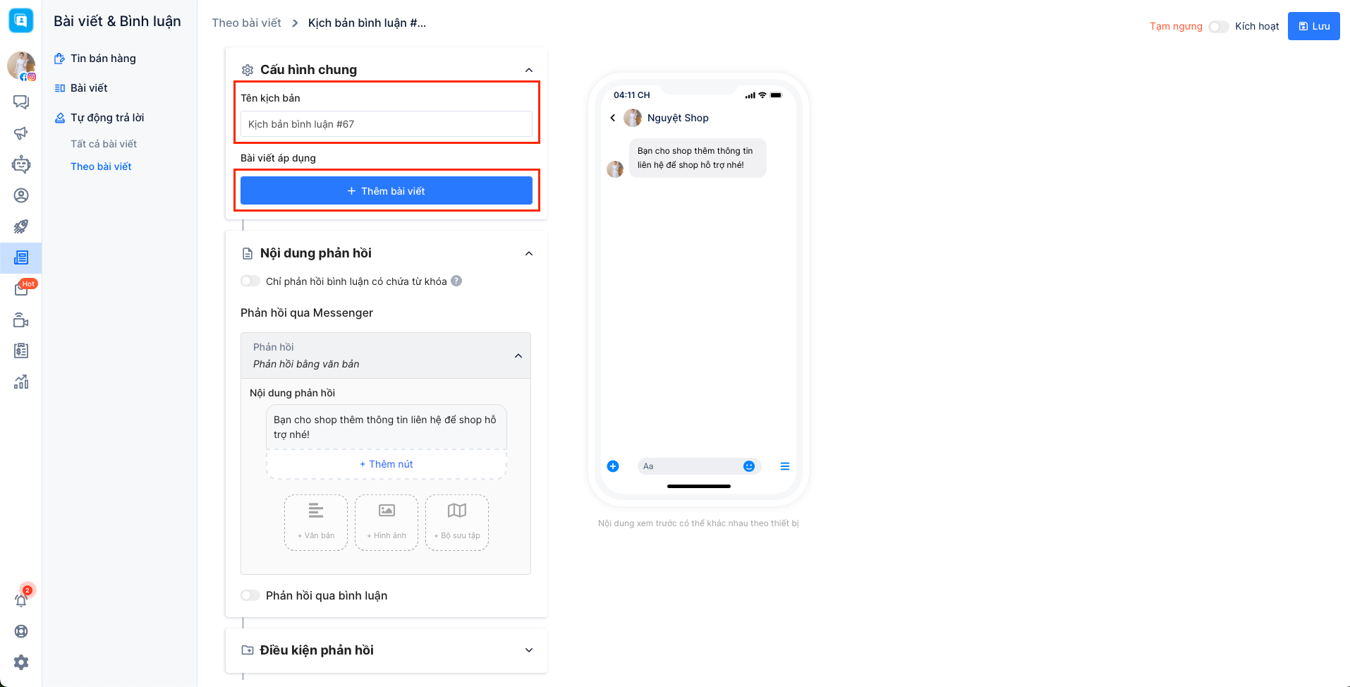 ⏩ Điểm nổi bật có ở công cụ kịch bản theo bài viết đó chính là có thể trả lời được bình luận cho tất cả hình ảnh trong bài viết tổng (bài viết có chứa nhiều hình ảnh). Ngoài ra, bạn cũng có thể tạo riêng kịch bản cho từng hình ảnh. Điều này giúp cho thao tác trả lời bình luận của khách hàng được đa dạng hơn, đúng với mục đích của từng hình ảnh.
