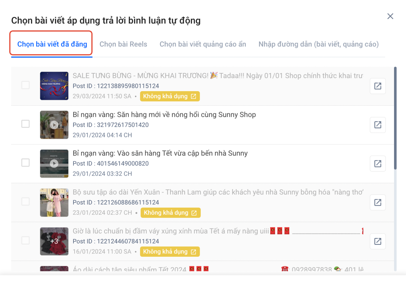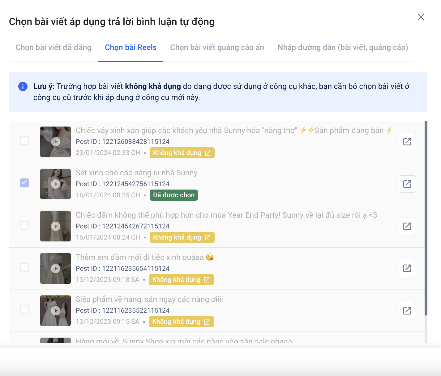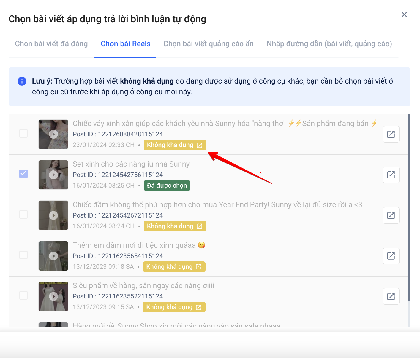 - Trường hợp bài viết không khả dụng do đang được sử dụng ở công cụ khác, bạn cần bỏ chọn bài viết ở công cụ cũ trước khi áp dụng ở công cụ mới này.