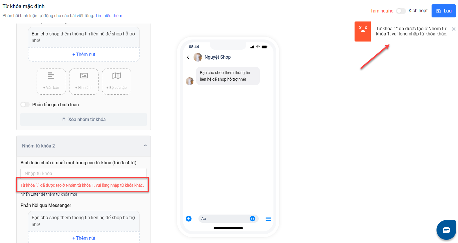 - Các từ khóa giữa các nhóm không được trùng nhau. Nếu có từ khóa trùng nhau, hệ thống sẽ hiển thị thông báo lỗi như sau: