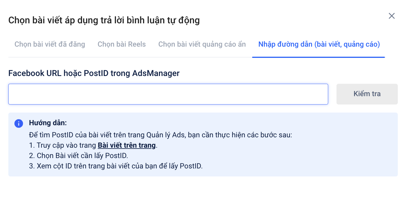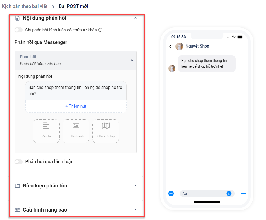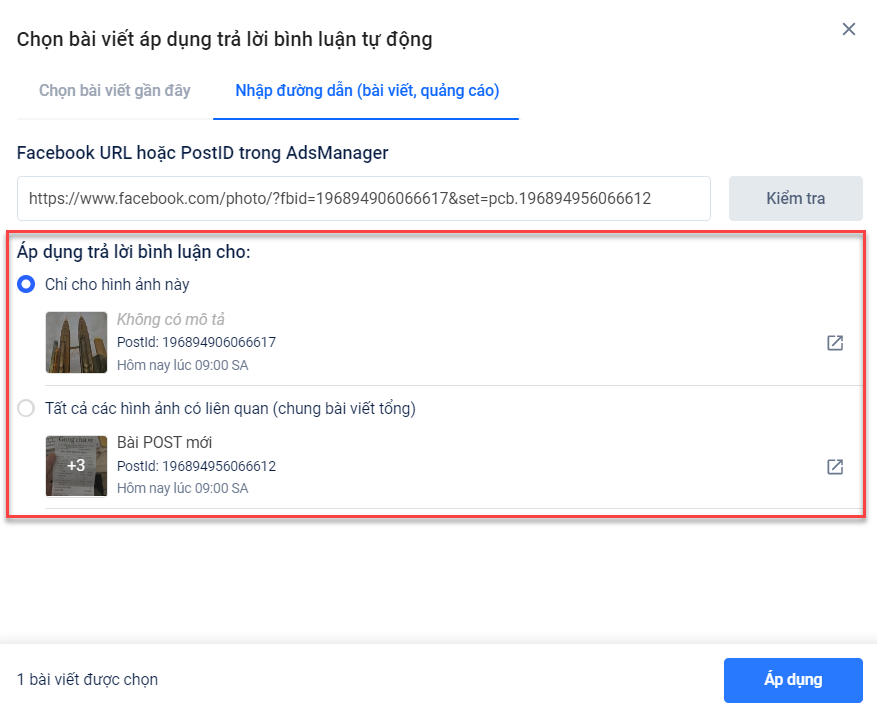 - **Tính năng 2:**khi bạn có nhu cầu ở mỗi hình ảnh trong bài viết tổng sẽ có 1 kịch bản phản hồi khác nhau, bạn chỉ cần nhập Facebook URL hoặc Post ID của hình ảnh mà bạn cần thiết lập. Khi đó sẽ có 2 trường hợp xảy ra: