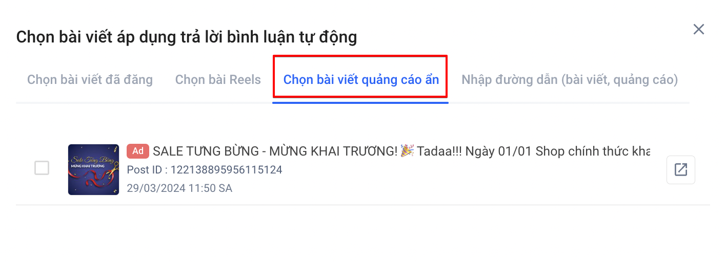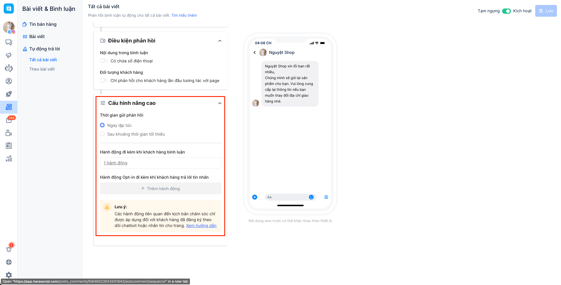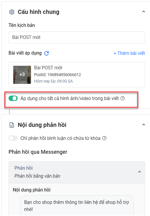 Với nút kích hoạt này, khi khách hàng bình luận ở bất kỳ hình ảnh nào trong bài viết tổng, công cụ sẽ áp dụng kịch bản của bài viết tổng để phản hồi cho những hình ảnh đó.