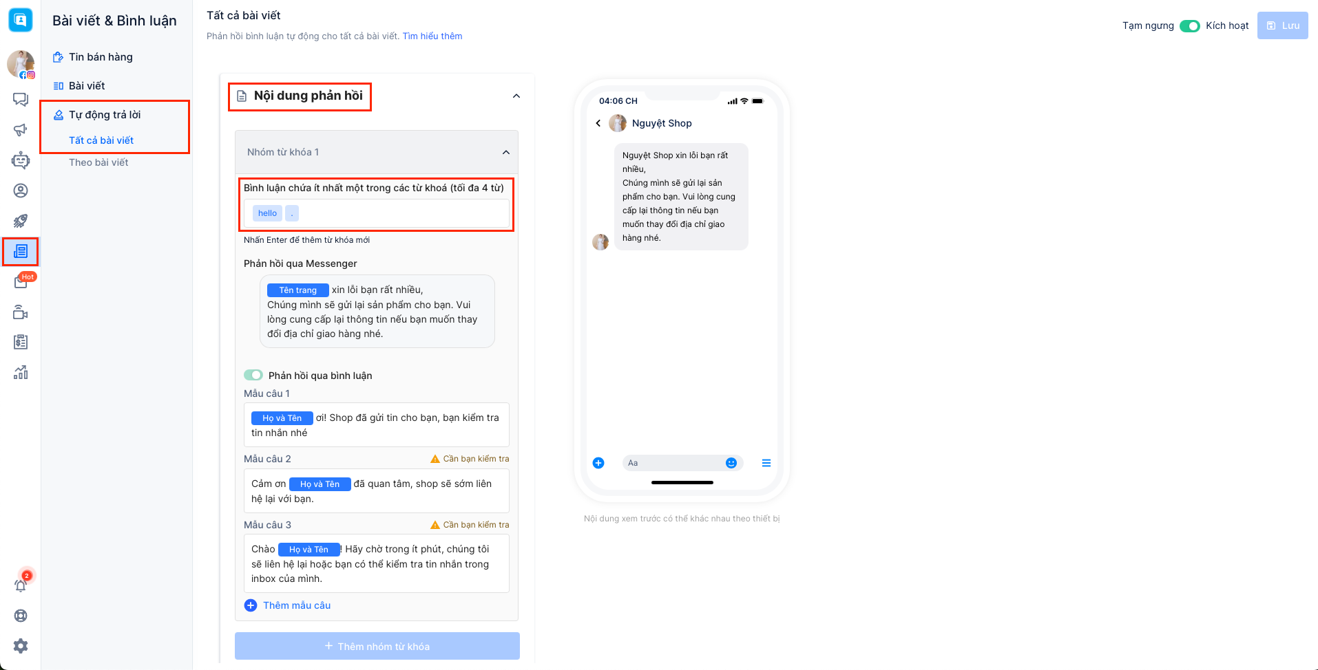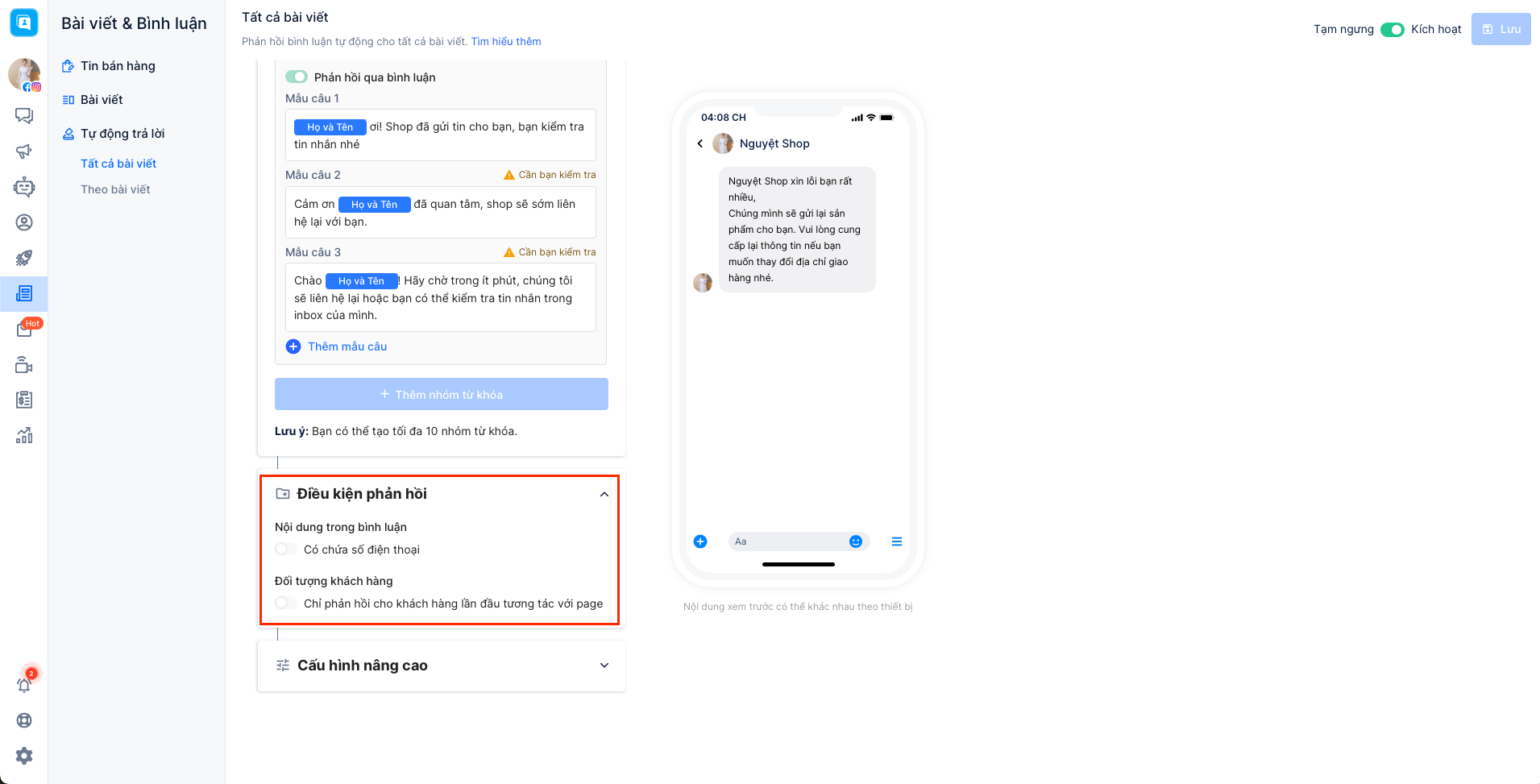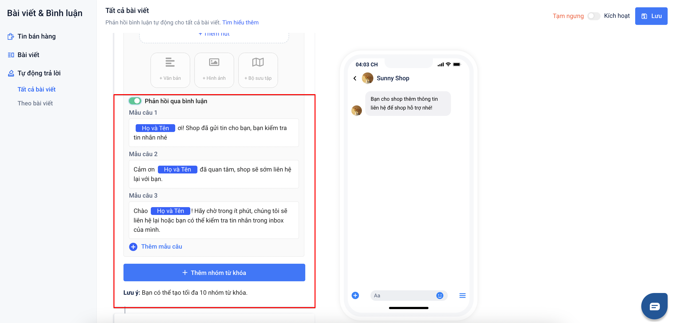 Hệ thống sẽ mặc định phản hồi xen kẻ dựa trên các mẫu câu phản hồi qua bình luận mà bạn thiết lập. Bạn bắt buộc phải thiết lập 3 mẫu câu phản hồi và có thể tạo tối đa là 10 mẫu câu, bên cạnh đó trong nội dung phản hồi cần phải chứa trường