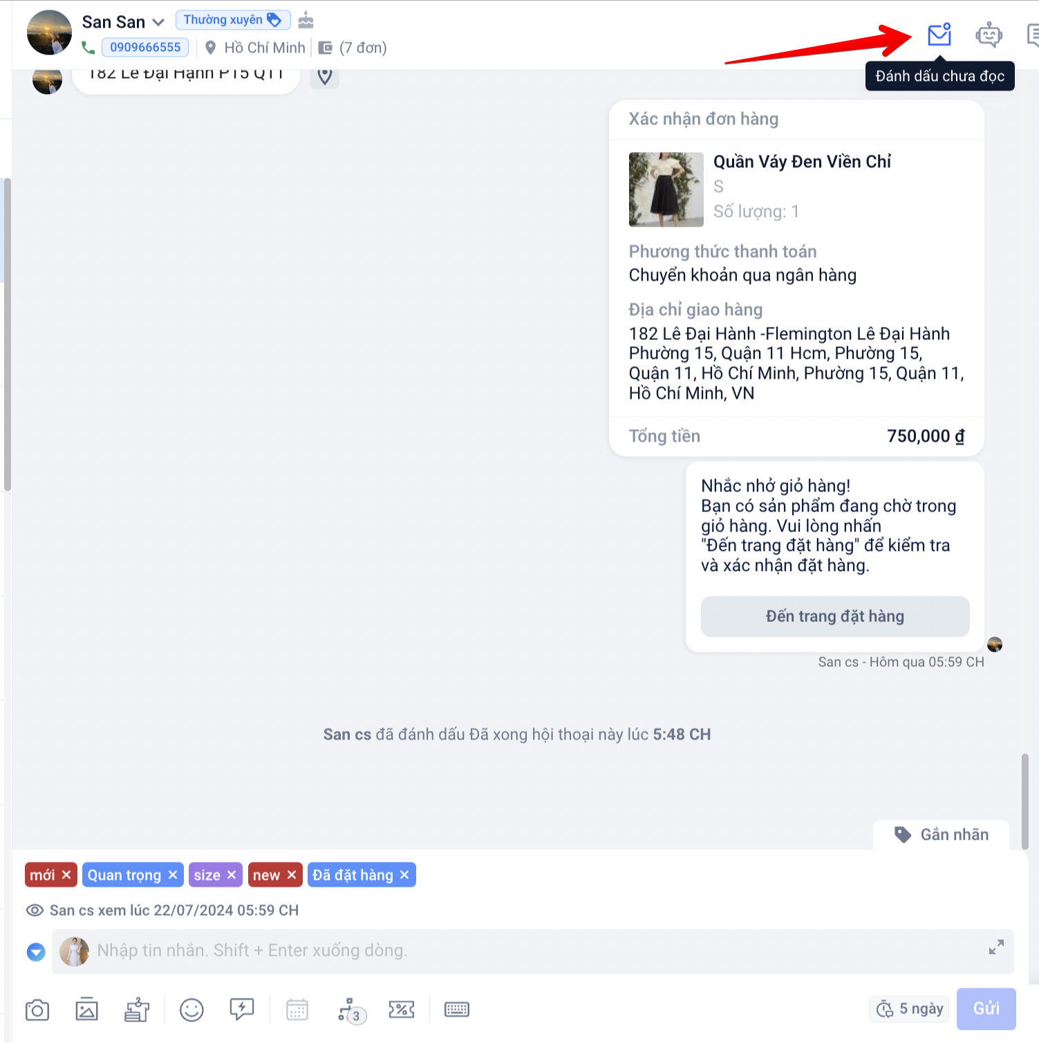 c. Đánh dấu chưa đọc: trong trường hợp bạn vô tình ấn vào hội thoại để xem nhưng chưa phản hồi, điều này có thể làm ảnh hưởng đến các nhân viên trực chat khác. Chính vì vậy, để hoàn tác lại hành động đó bạn có thể nhấp vào nút “Đánh dấu chưa đọc”.