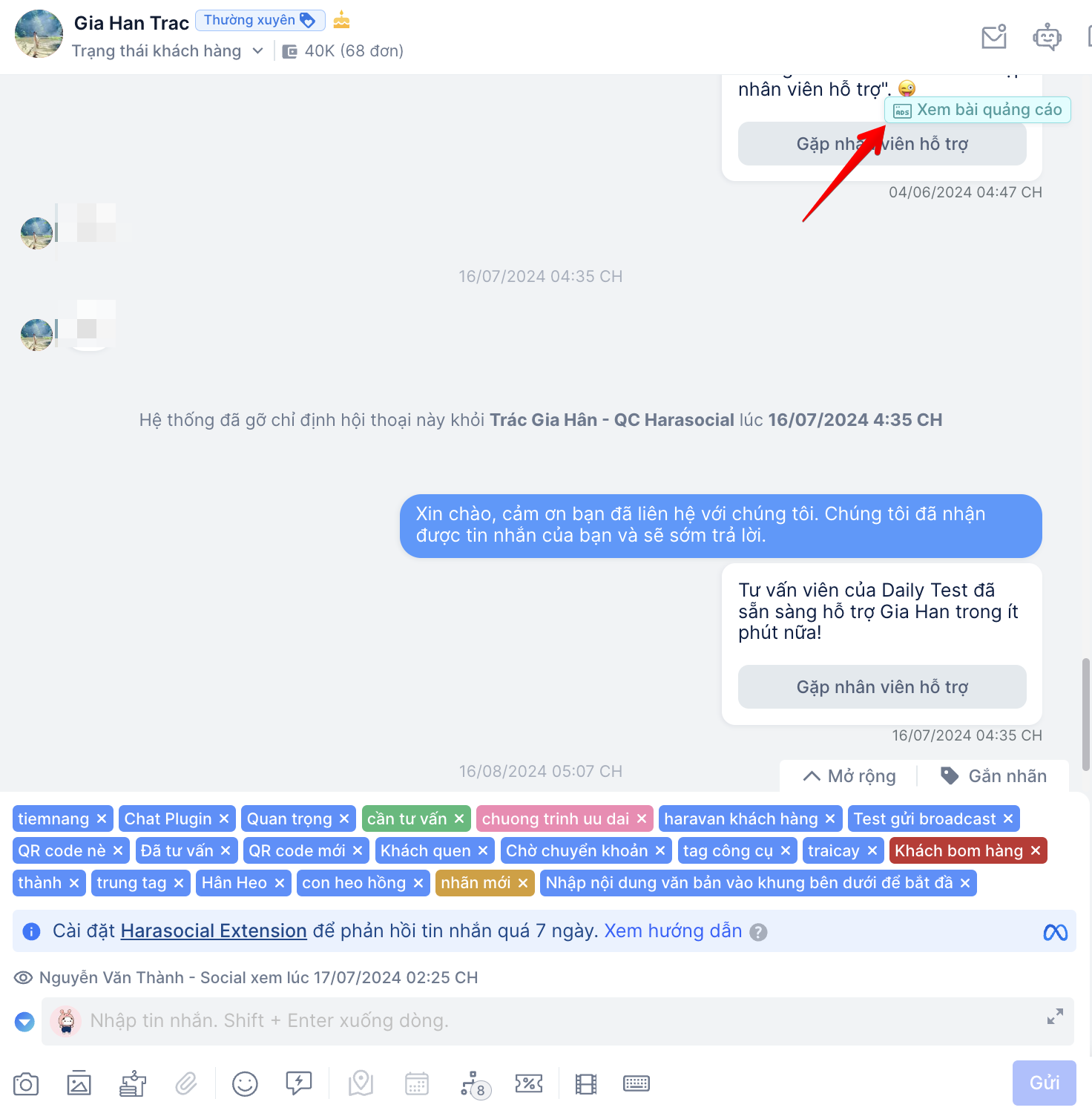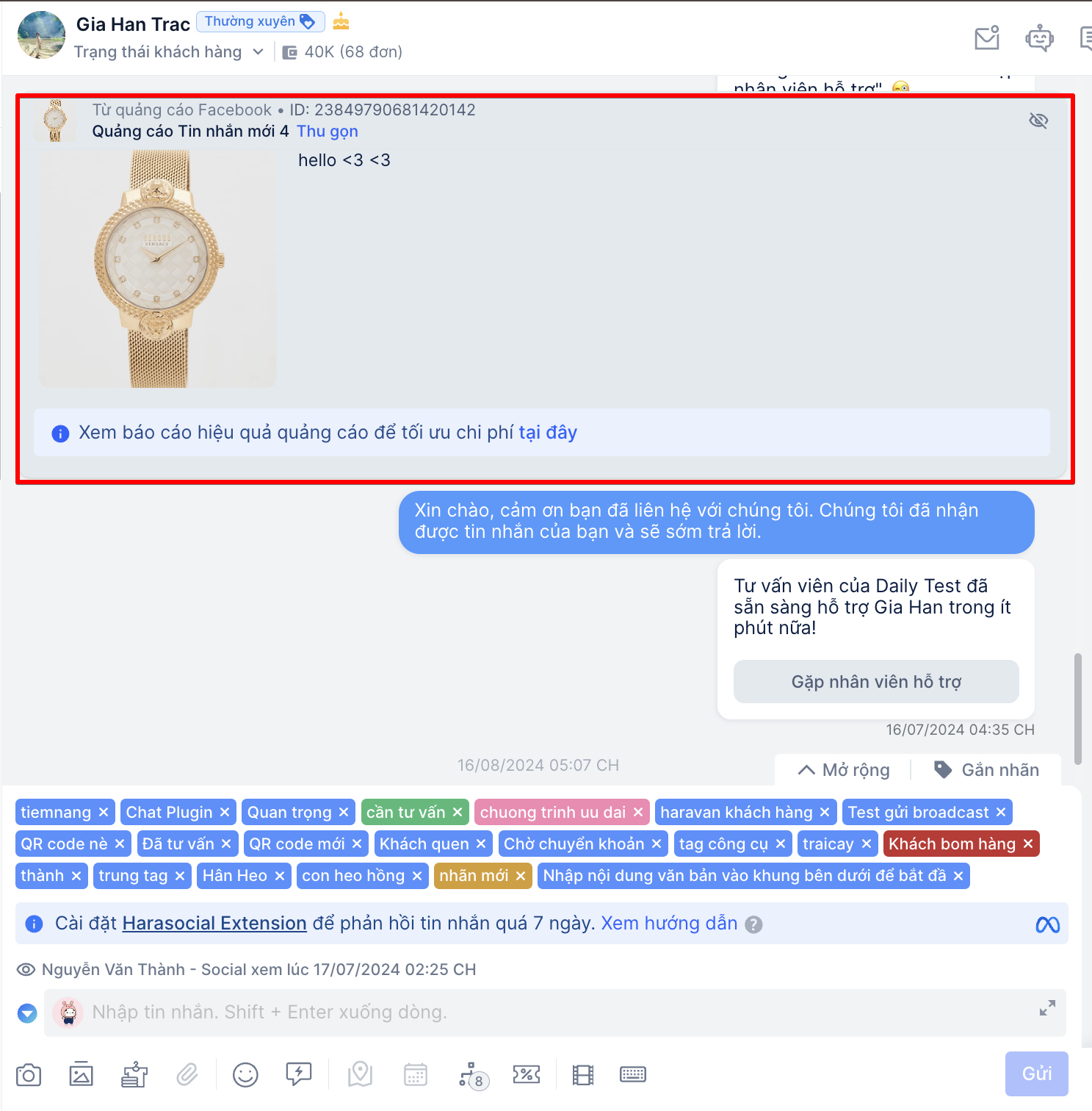 b. Hiển thị chi tiết quảng cáo (ADS): hệ thống sẽ hiển thị được chi tiết tin nhắn khách hàng đang đến từ chiến dịch quảng cáo nào, bạn có thể nhấn vào để xem mở rộng chi tiết quảng cáo đó. Hệ thống sẽ hiển thị quảng cáo gần nhất và thay đổi thông báo quảng cáo khi có tương tác của khách hàng trên quảng cáo mới.