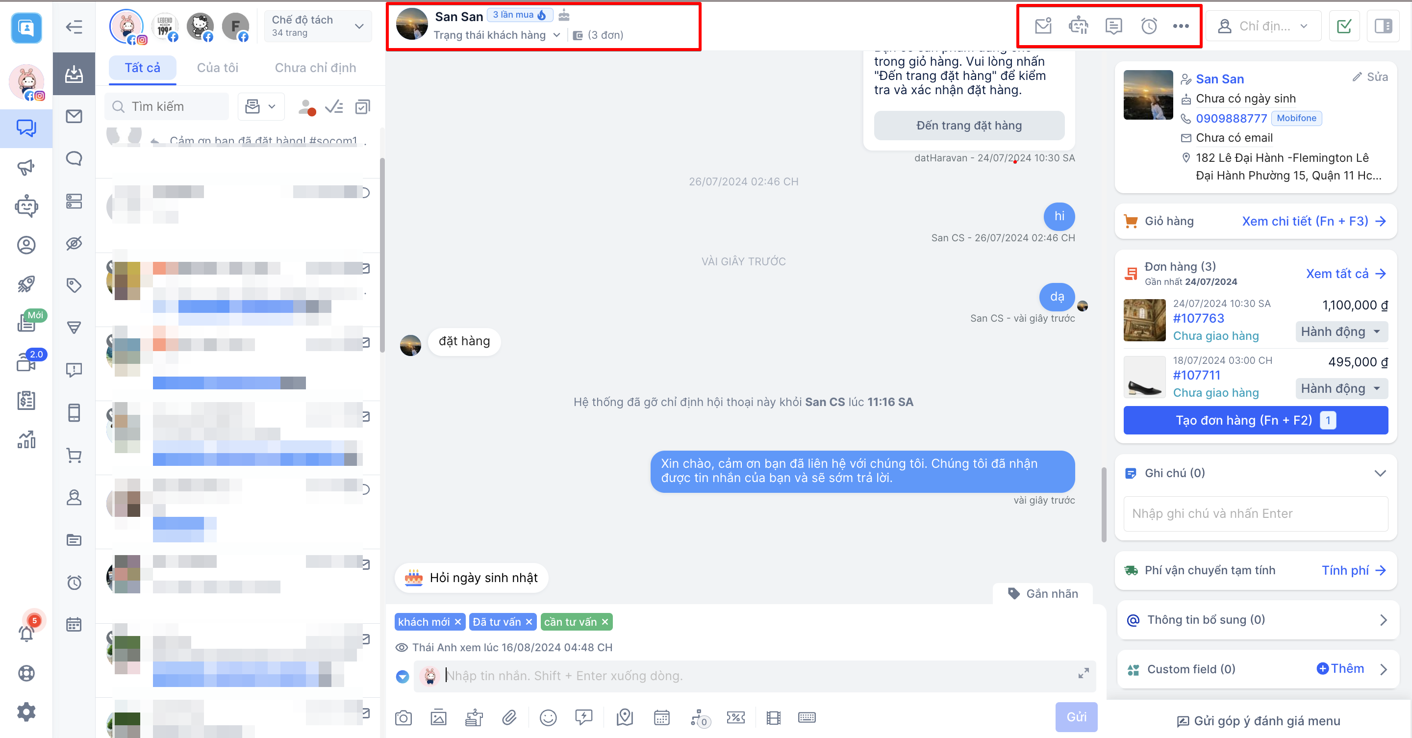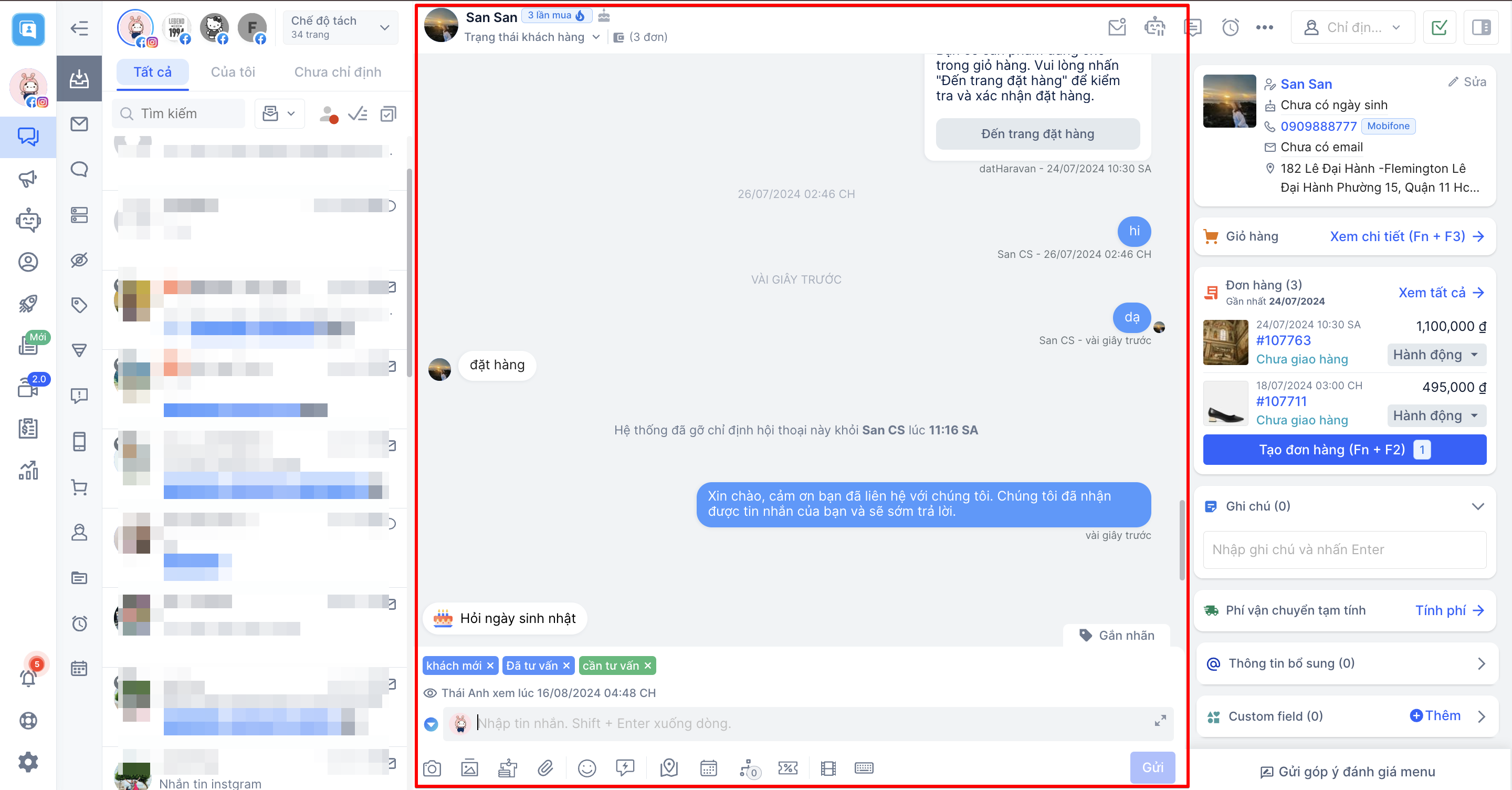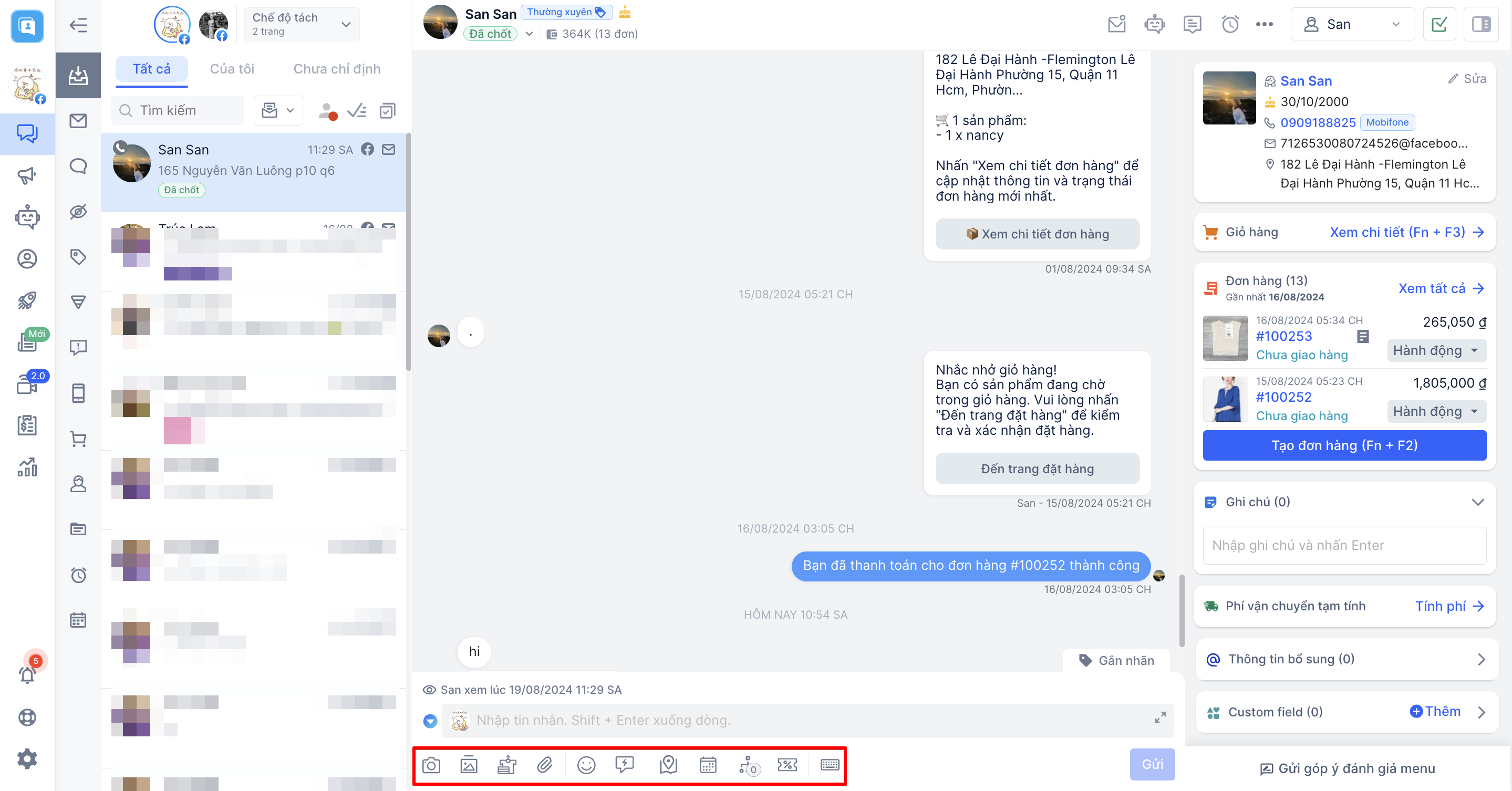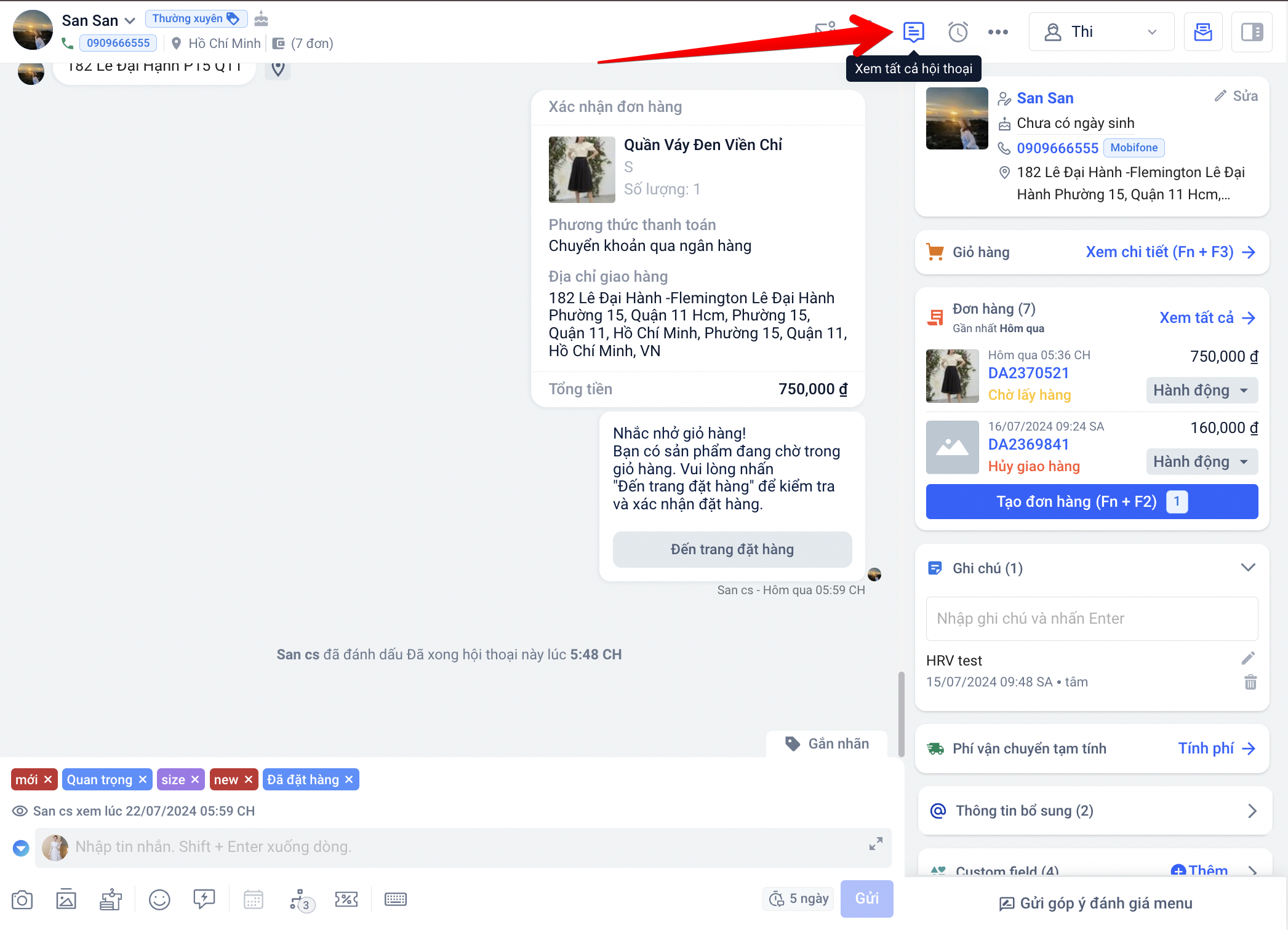 e. Xem tất cả hội thoại: Khi nhấp vào nút, hệ thống sẽ hiển thị danh sách tất cả hội thoại của cùng 1 khách hàng mà bạn đang nhắn tin.