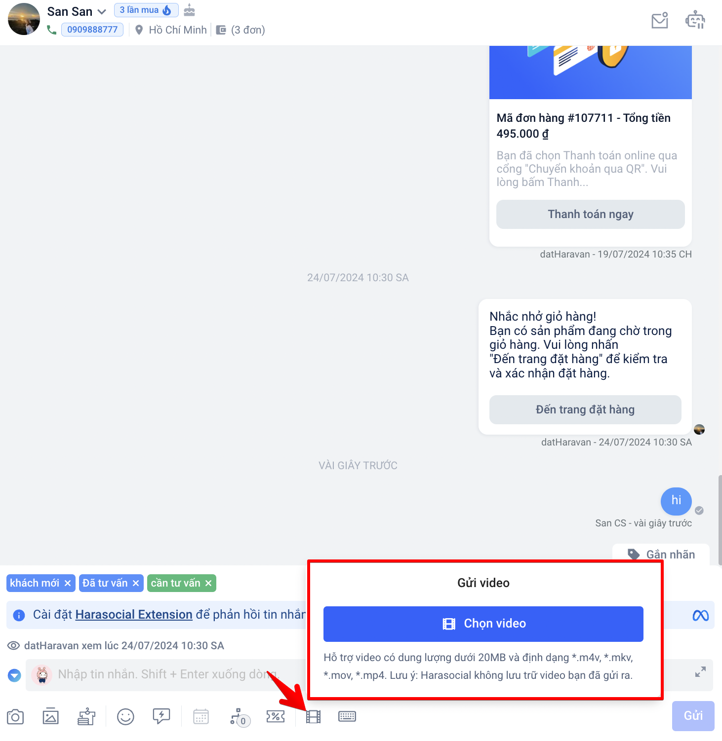 - Hiện tại để sử dụng được công cụ gửi video, bạn vui lòng liên hệ với Haravan để thực hiện đăng ký mở thêm gói tính năng.