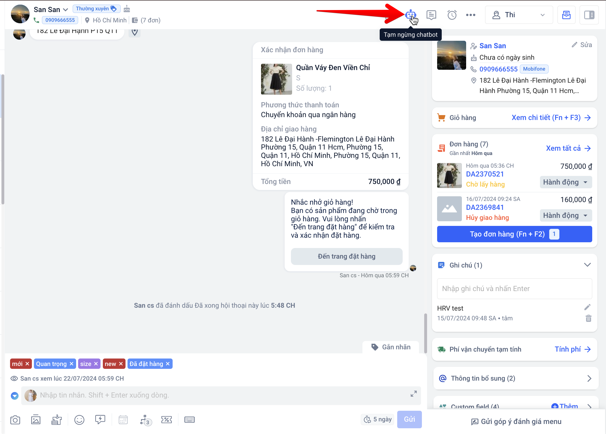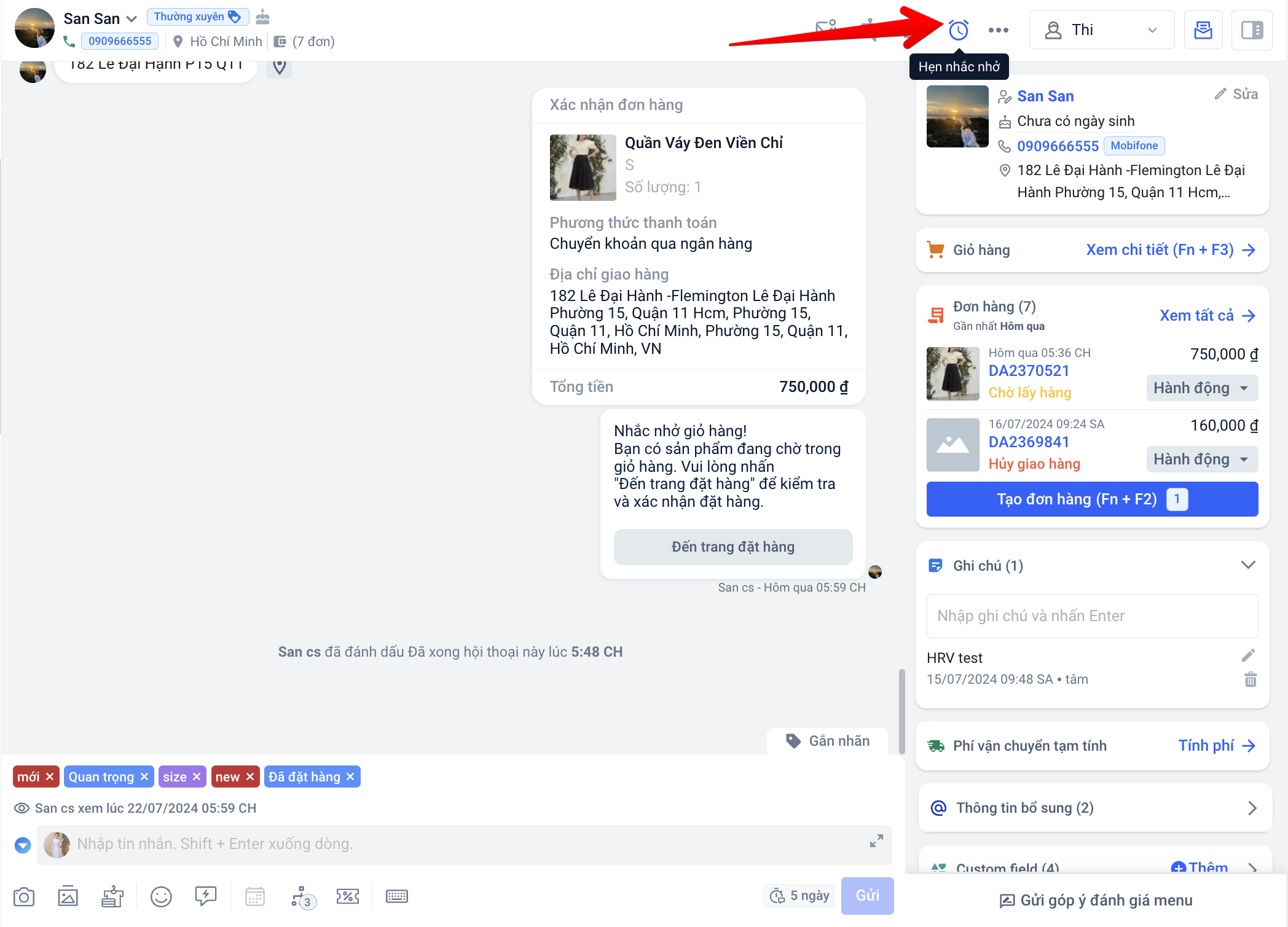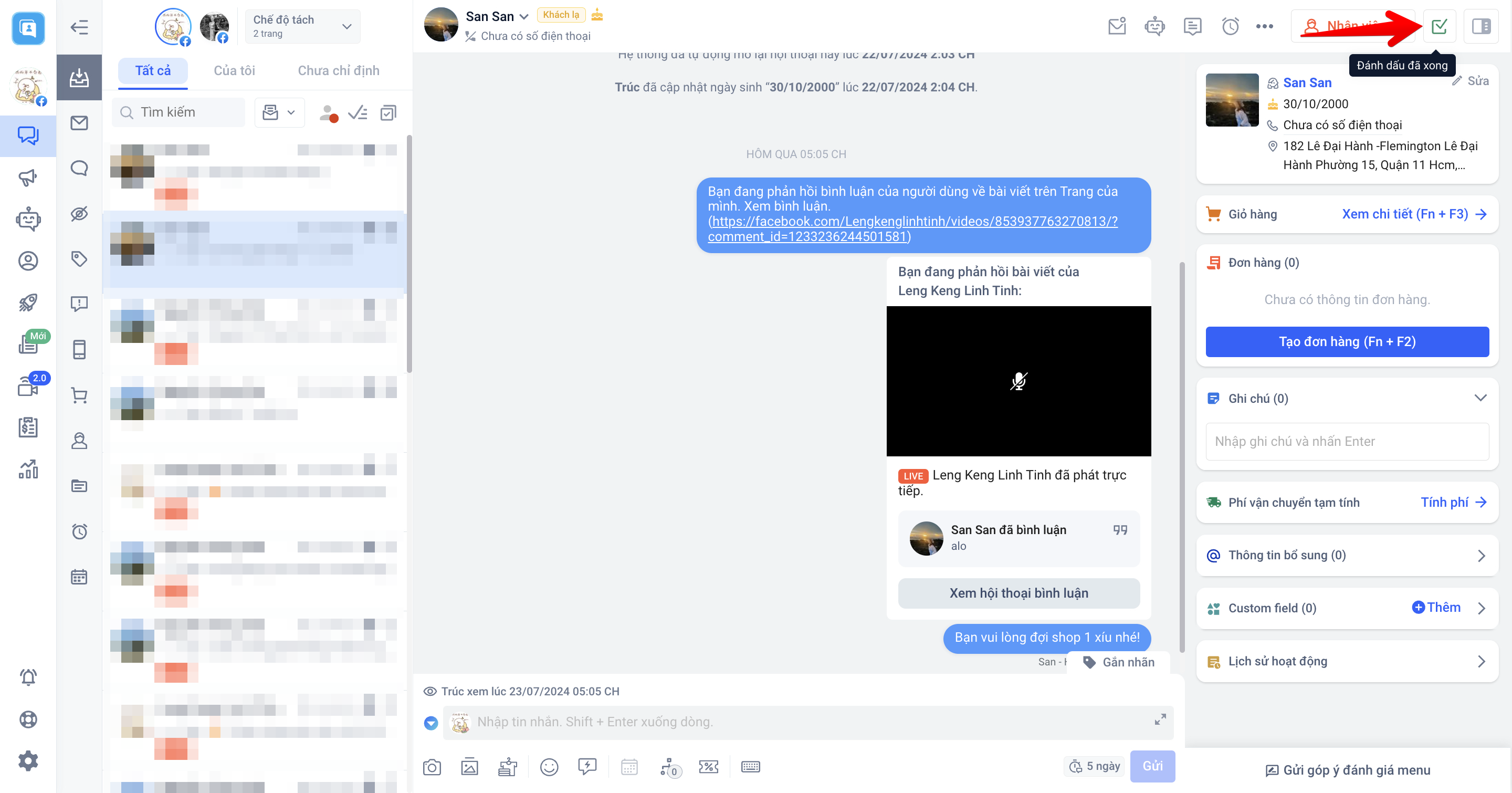h. Đánh dấu đã xong: Khi bạn đã xử lý xong hội thoại, hãy nhấn vào nút “Đánh dấu đã xong” để phân loại các hội thoại cho các nhân viên khác xử lý.