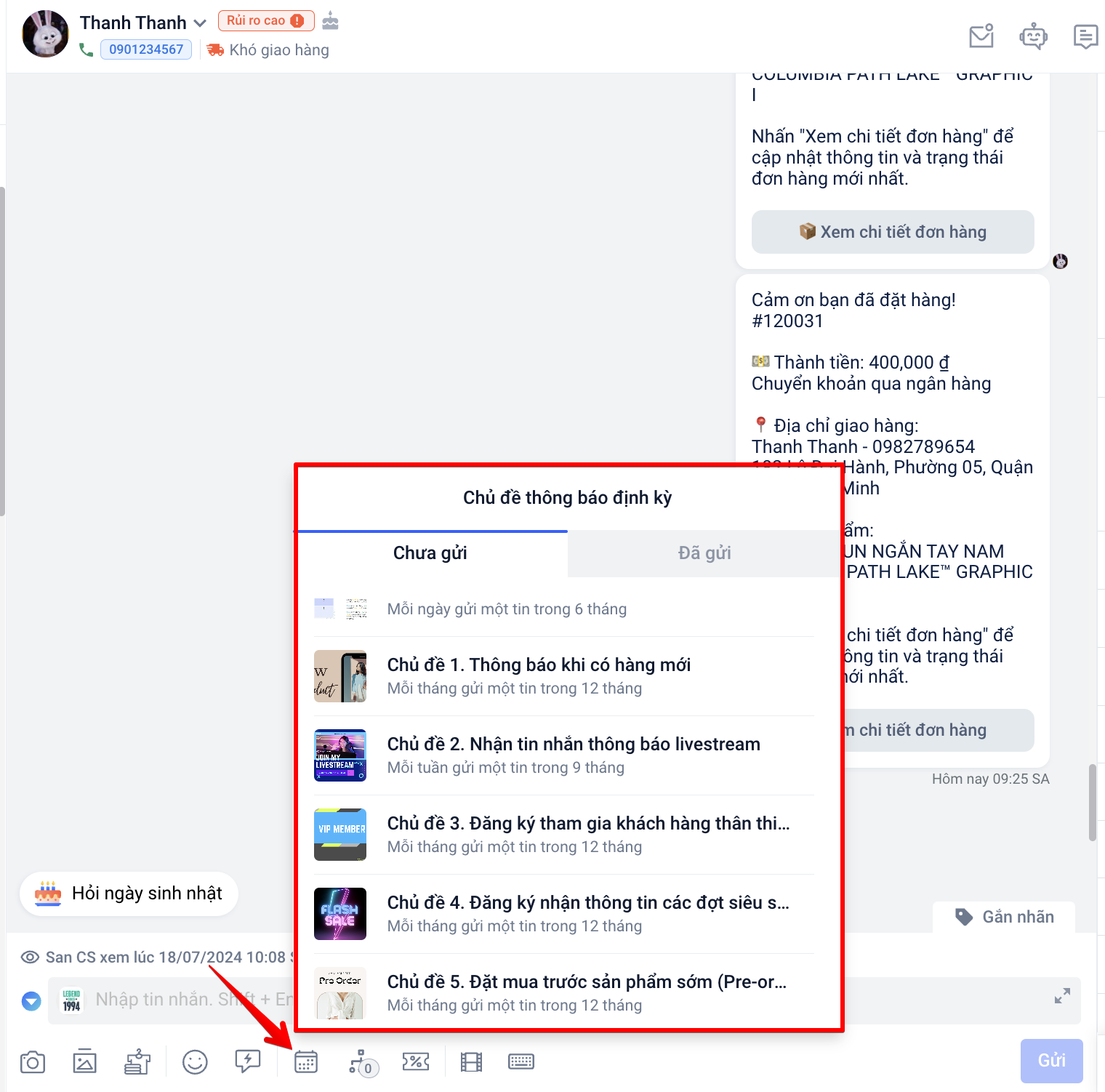 h. Tính năng gửi chủ đề thông báo định kỳ: với tính năng này, nhân viên có thể trực tiếp gửi các chủ đề thông báo định kỳ đến cho khách hàng, bạn có tìm hiểu theo về tính năng này tại đây.