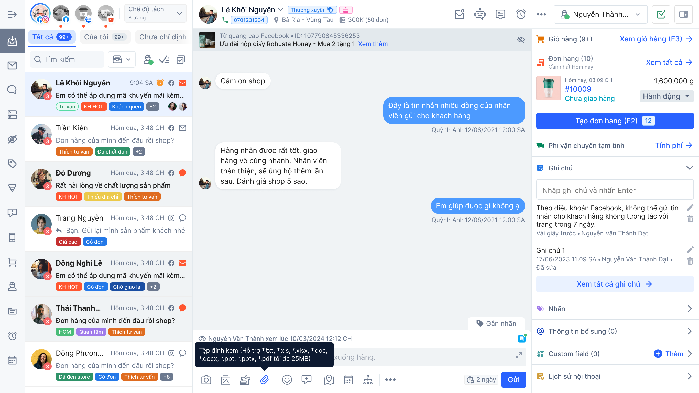 **d. Tệp đính kèm:**Hỗ trợ cho 2 kênh bao gồm Facebook + Zalo