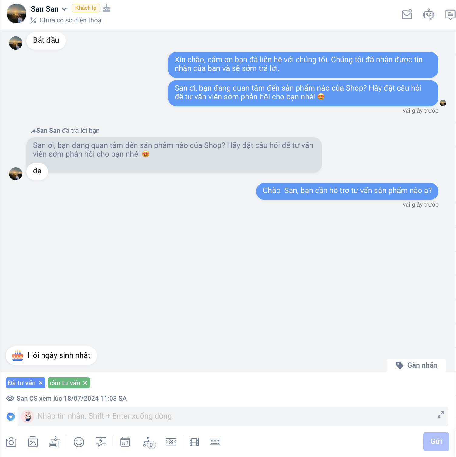- **Trạng thái khách hàng:**hỗ trợ nhân viên có thể phân loại và nhận biết được giai đoạn mua hàng của khách, từ đó sẽ có các bước tư vấn cũng như các hành động phù hợp để xử lý với hội thoại đó, giúp tối ưu quảng cáo và tăng tỷ lệ chuyển đổi doanh thu.