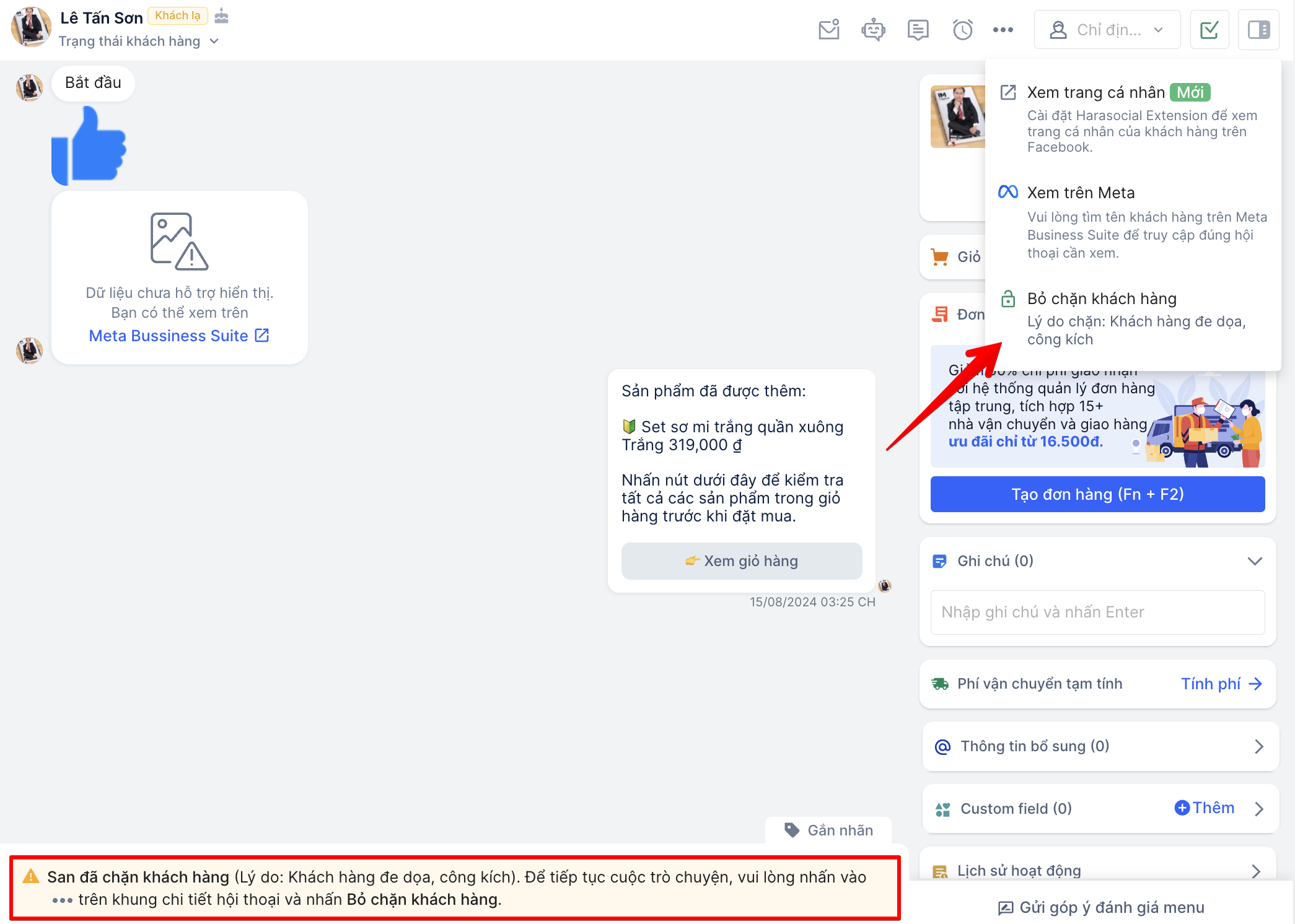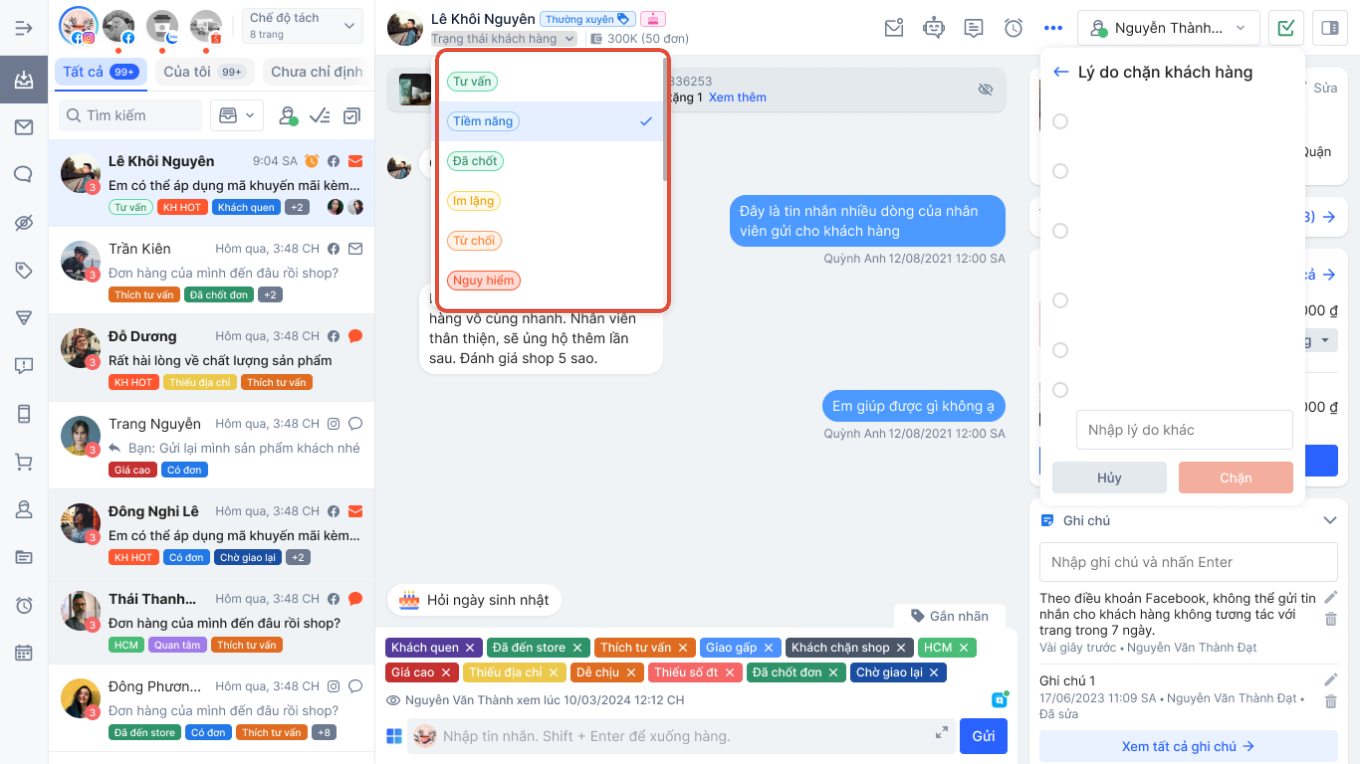 - **Chặn khách hàng:**Đối với một số trường hợp khách hàng có hành động không phù hợp như: ngôn ngữ vi phạm chuẩn mực đạo đức, khách đe dọa công kích, khách spam các tin nhắn rác, lừa đảo hoặc khách bom hàng...