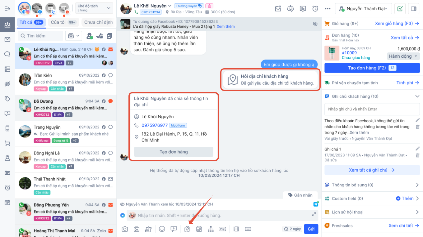 **g. Hỏi địa chỉ khách hàng:**dành riêng cho các hội thoại tin nhắn từ Facebook, tính năng gửi mẫu hỏi địa chỉ khách hàng sẽ có thể hoạt động trong 24h kể từ thời điểm khách hàng tương tác. Khách hàng sẽ nhận được mẫu để nhập các thông tin cá nhân như tên, số điện thoại và địa chỉ, từ đó dựa vào thông tin mà khách hàng đã cung cấp thì nhân viên có thể trực tiếp tạo đơn hàng từ đó một cách dễ dàng.