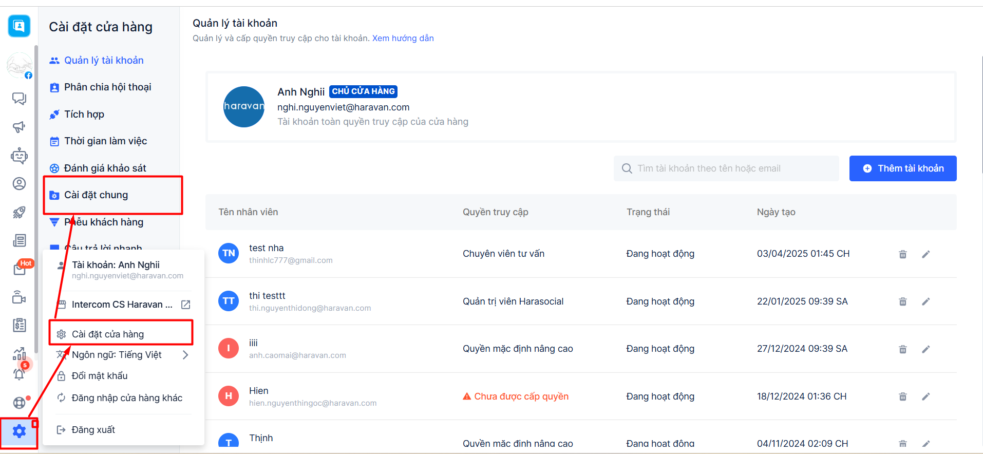1. Bạn dùng tài khoản toàn quyền, dăng nhập vào trang quản trị Harasocial -> chọn cấu hình -> chọn cài đặt cửa hàng -> chọn cài đặt chung ->