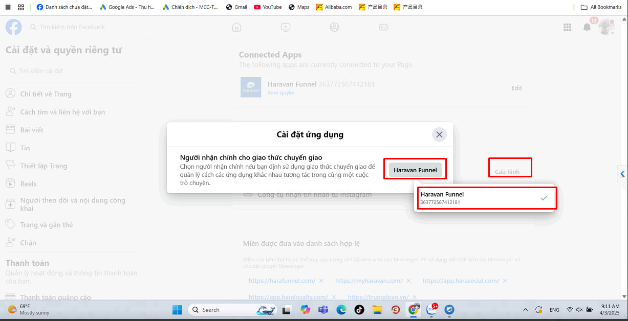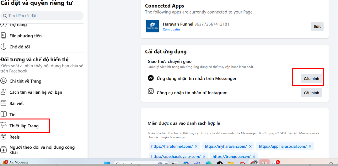 Cách kiểm tra: Vào fanpage đang kết nối với harasocial -> chọn Cài đặt -> thiết lập trang -> cấu hình