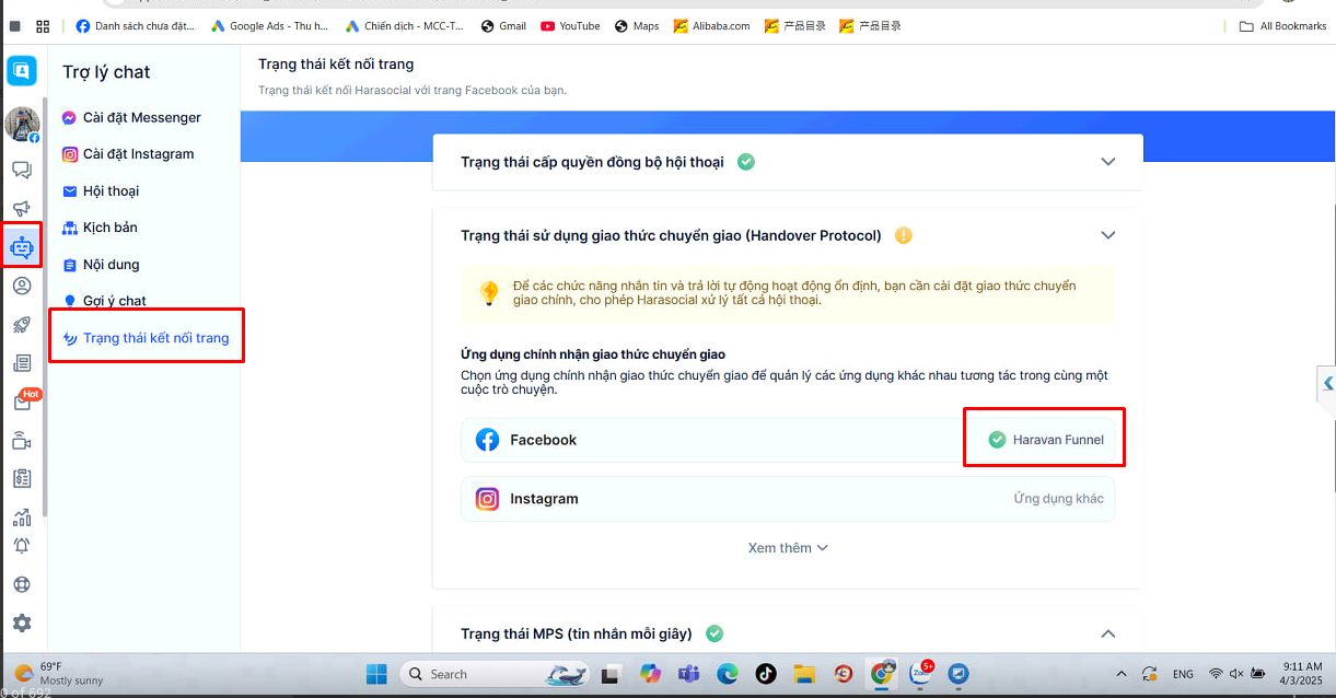 Sau đó về harasocial -> Trợ lý chat -> Kiểm tra kết nối trang đã thành công như hình là ok