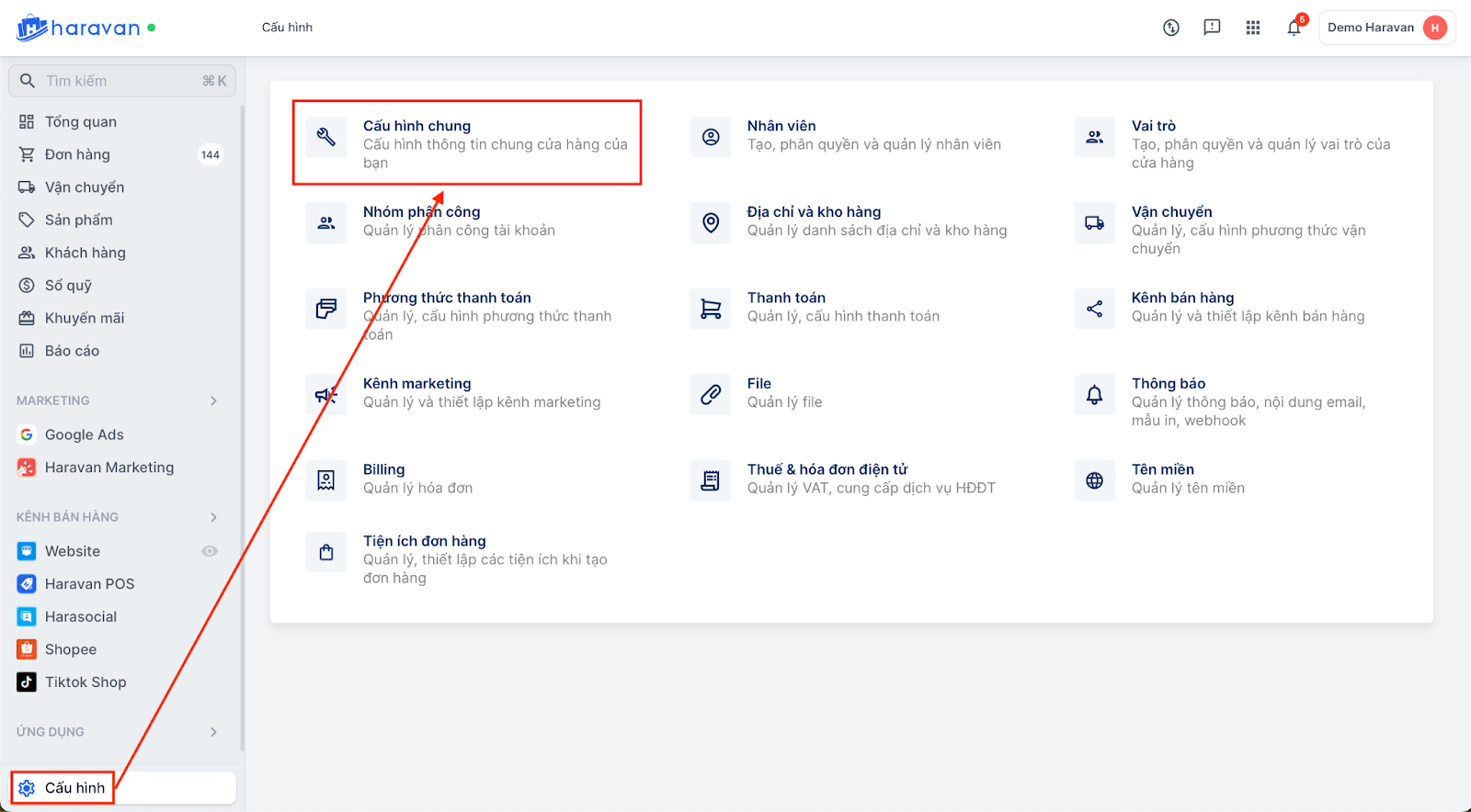 - Truy cập trang quản trị MyHaravan >> Chọn “Cấu hình” >> Bấm “Cấu hình chung”