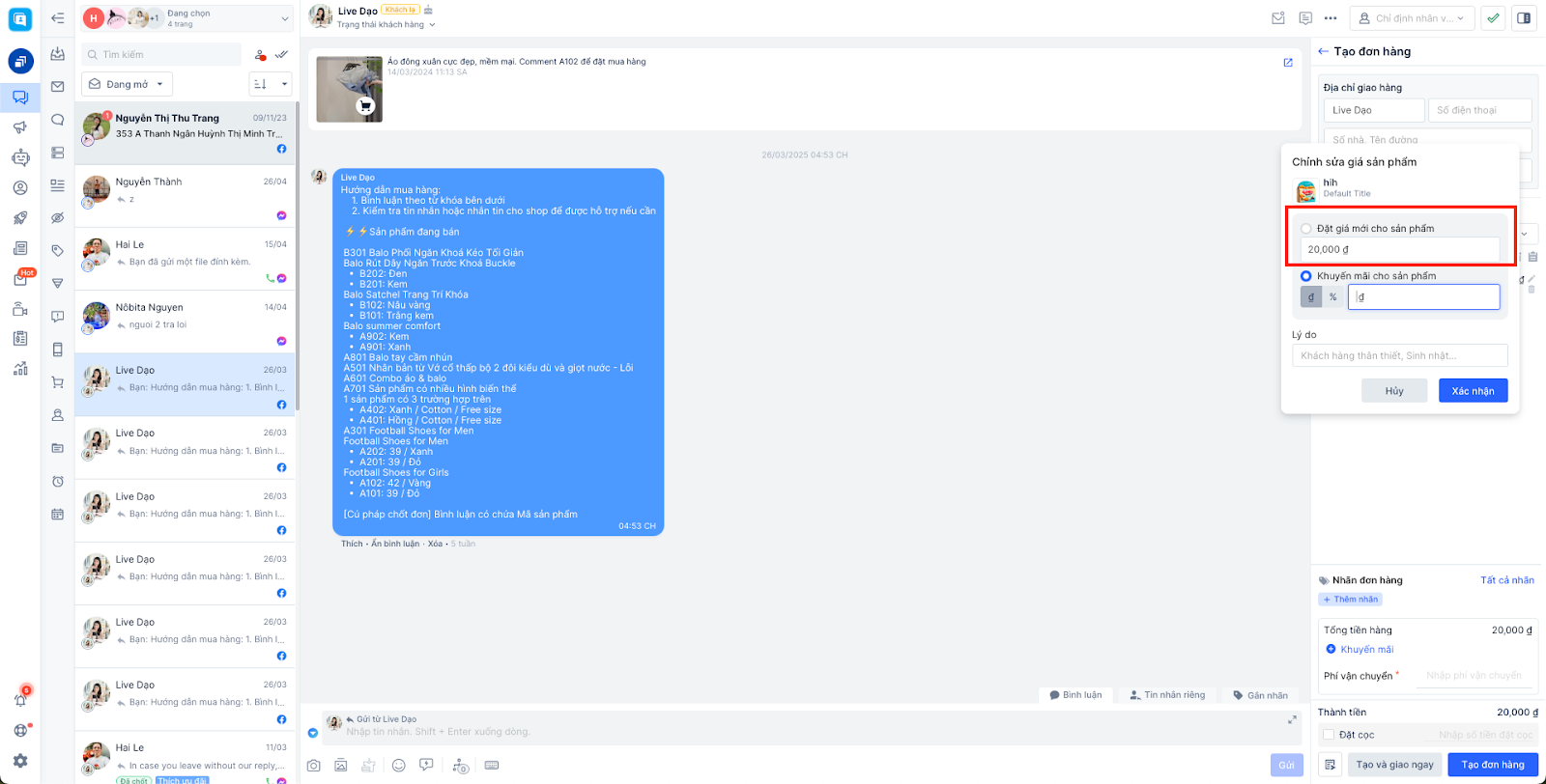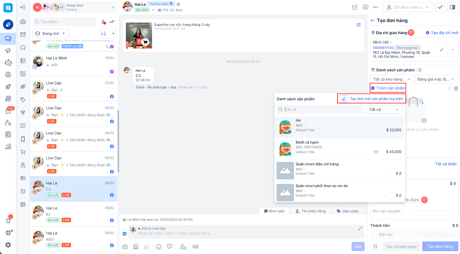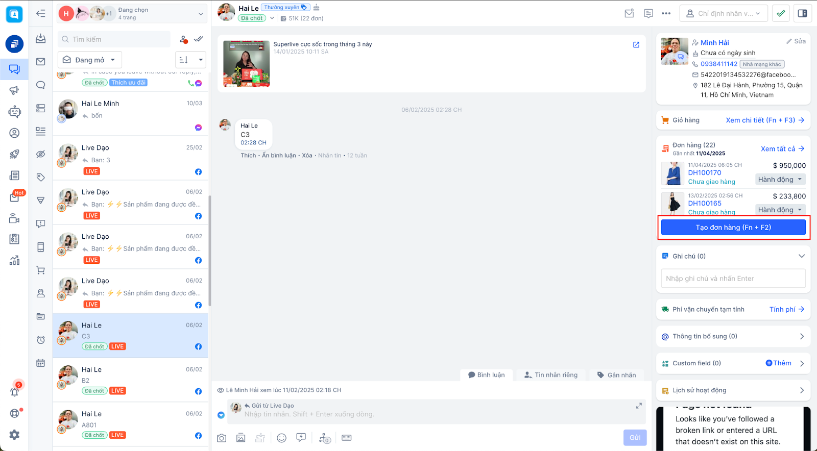 - Truy cập Harasocial >> Vào “Hội thoại” >> Chọn “Đơn hàng” và “Tạo đơn hàng”: