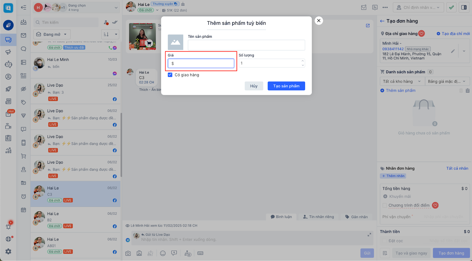 Tạo đơn hàng trong hội thoại Harasocial với đơn vị tiền tệ là USD và hiển thị số thập phân