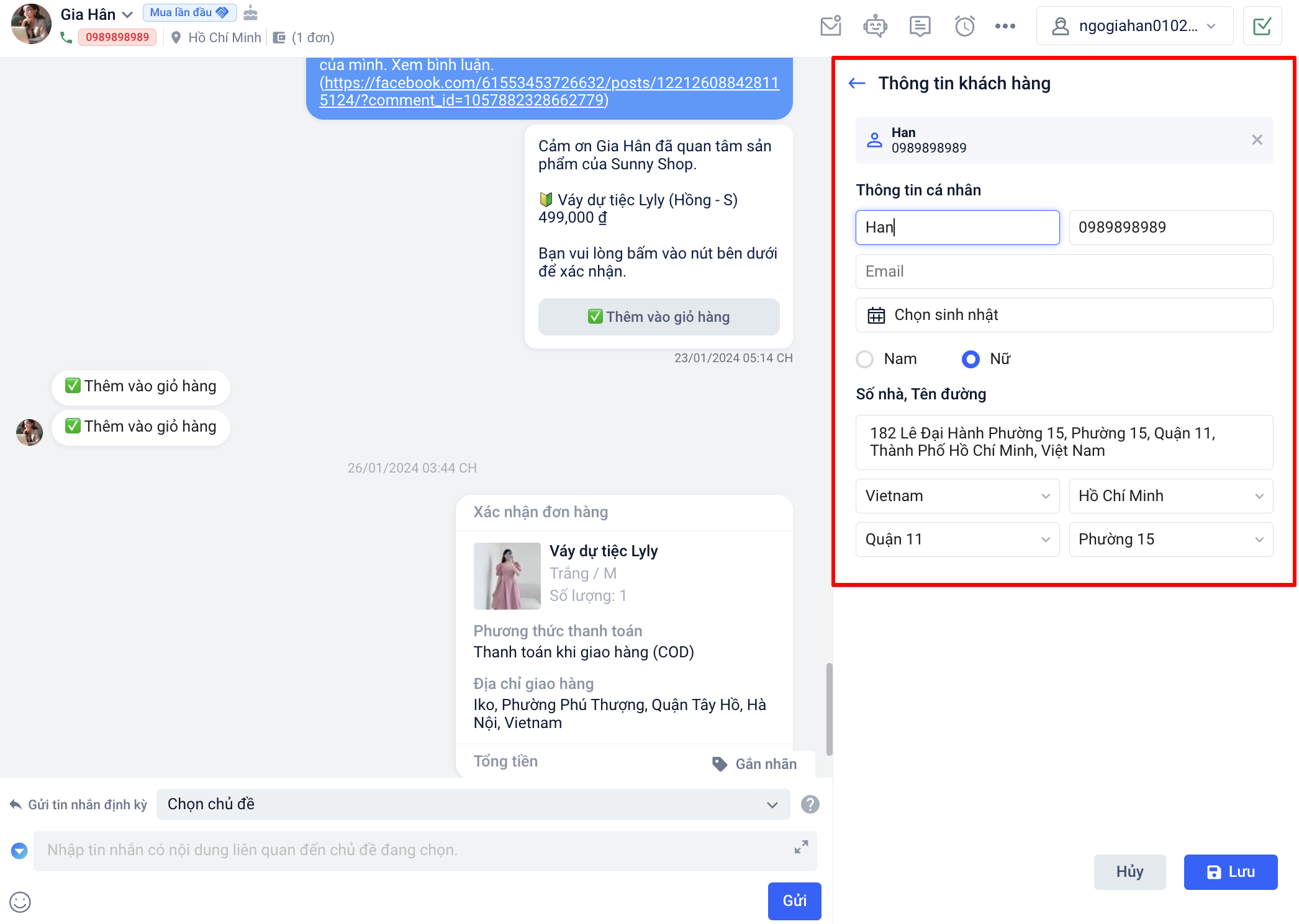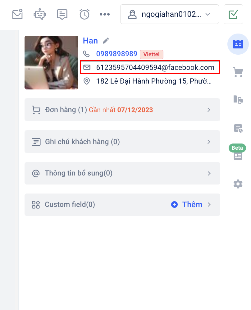 Bên cạnh khung chat, nhân viên có thể theo dõi được thông tin của khách hàng đang chat nhằm nắm bắt được các đặc điểm của khách hàng.