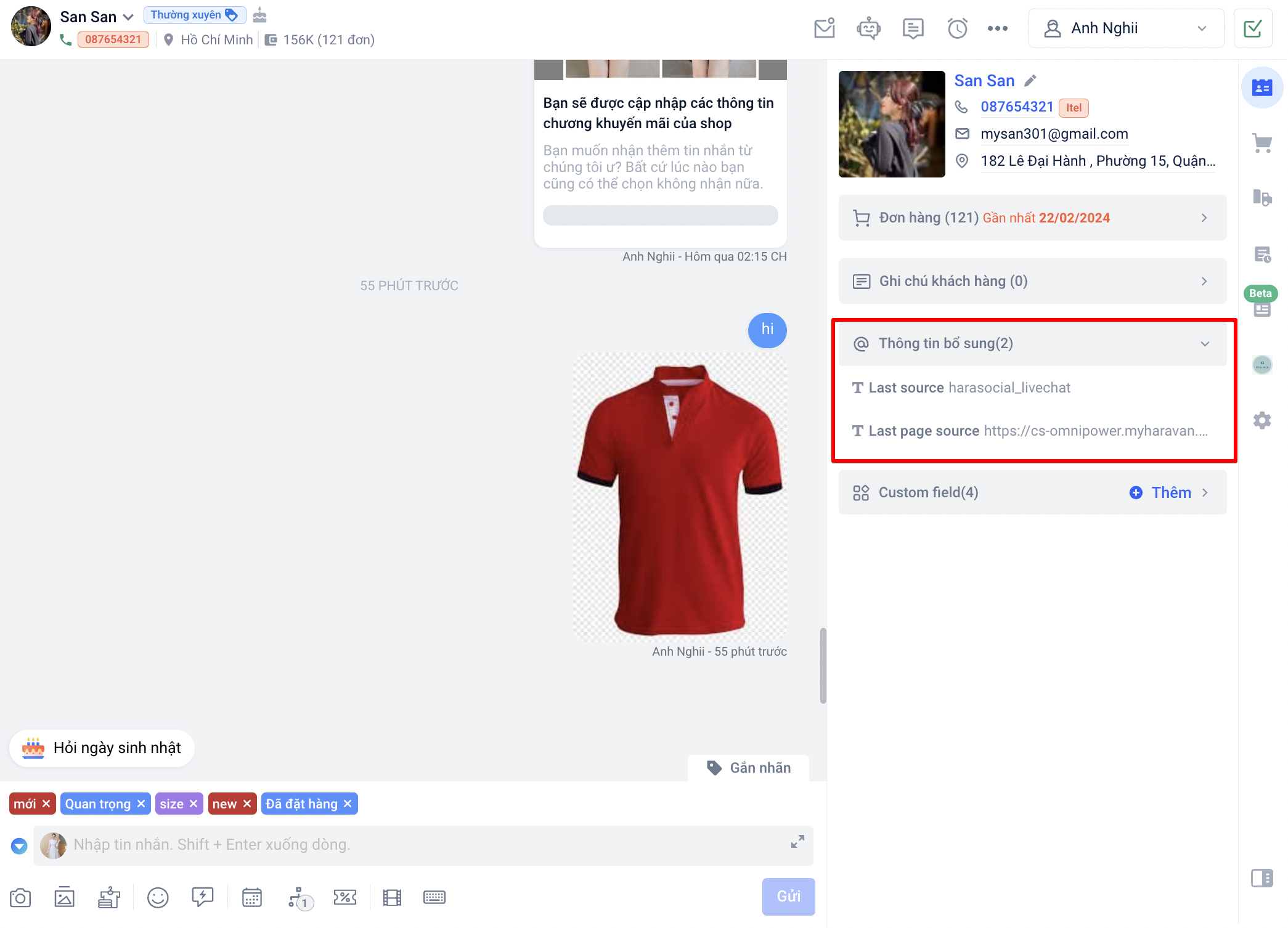 Ở mục thông tin bổ sung, các trường thông tin về khách hàng đến từ link, kênh chat hoặc chiến dịch nào sẽ được hiển thị để người bán có thể dễ dàng kiểm soát thông tin khách hàng.