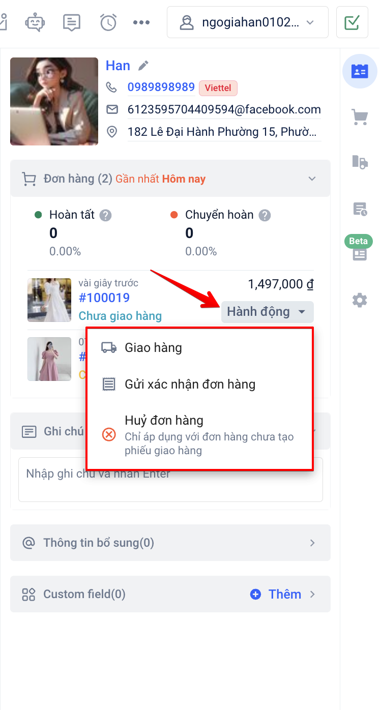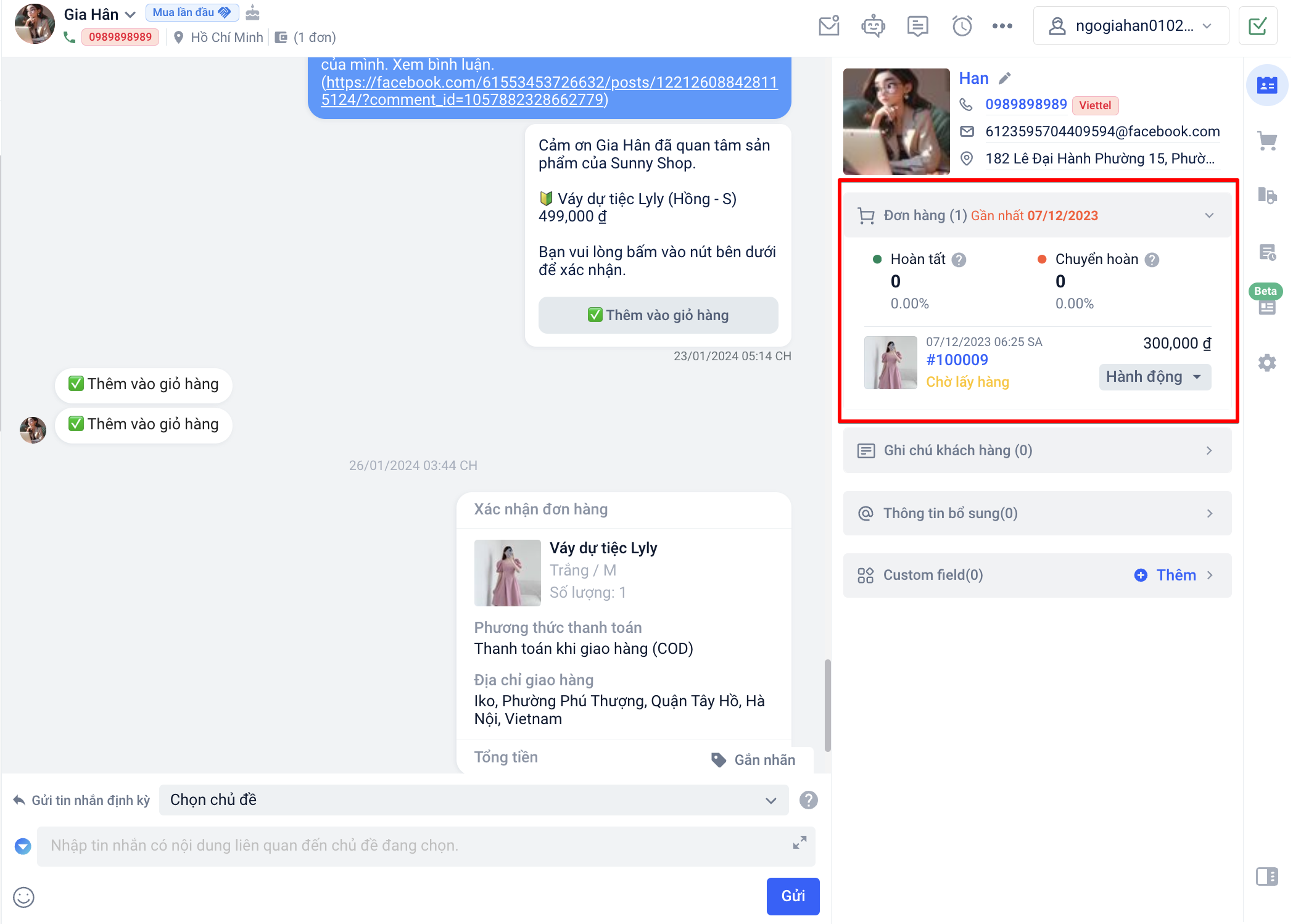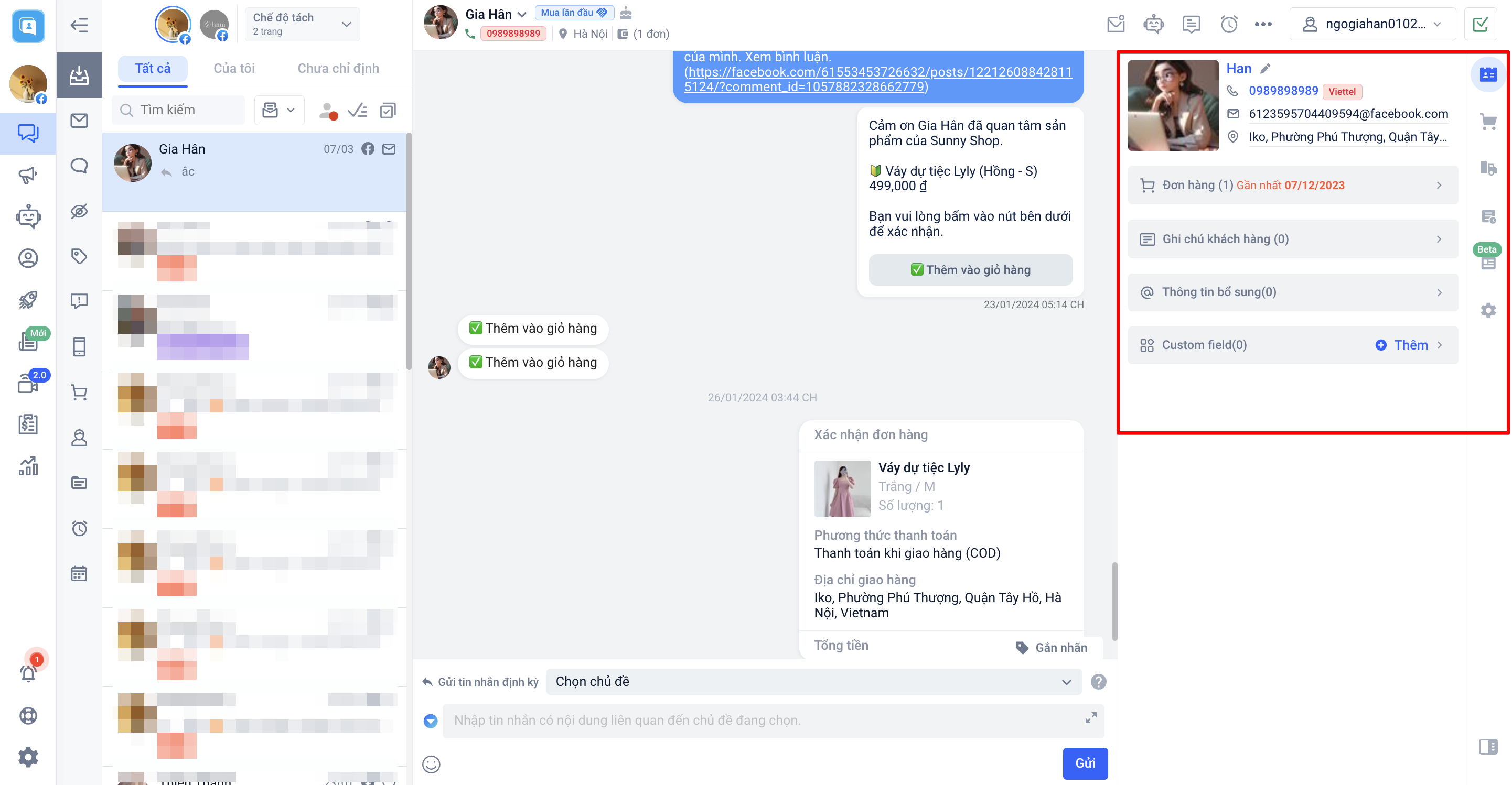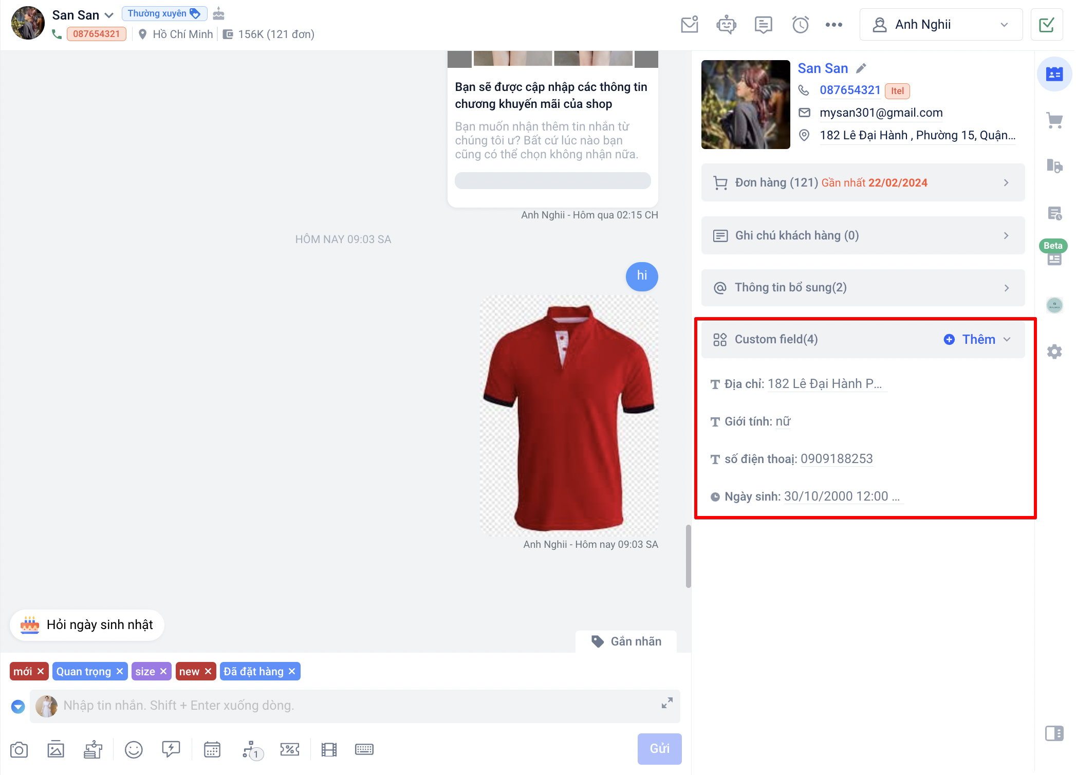 Các dữ liệu thông tin của khách hàng sẽ được hiển thị ngay trong khung Custom field để người bán có thể tiện theo dõi và cập nhật thông tin. Chọn "Thêm" để lọc thêm các trường thông tin của khách hàng.