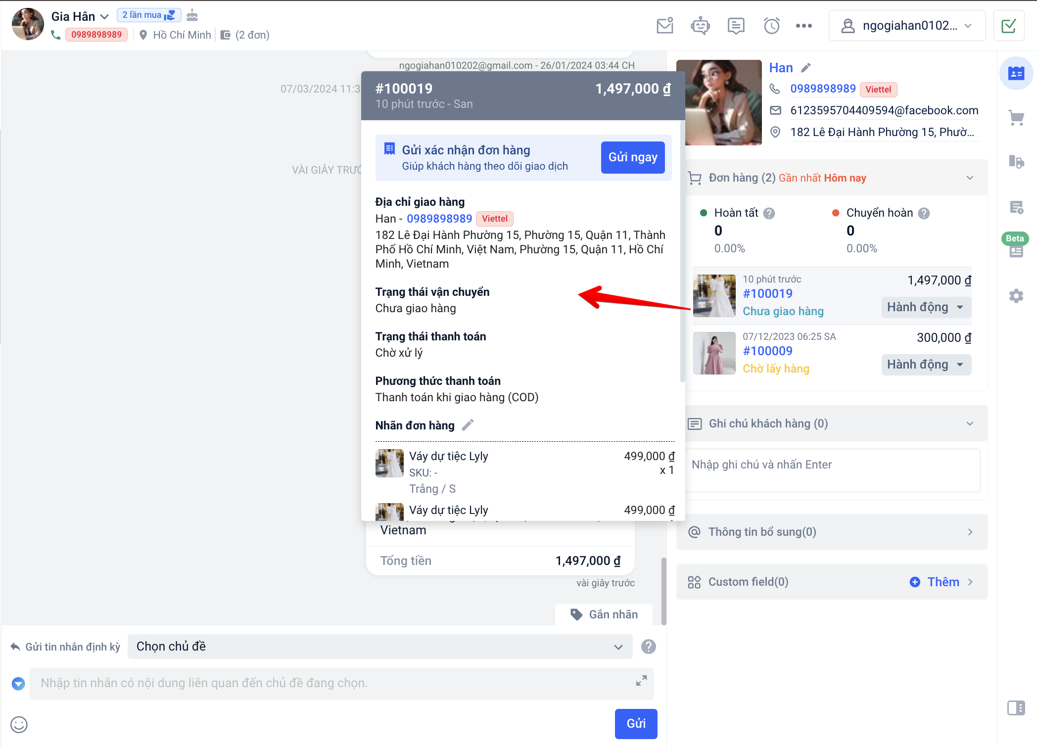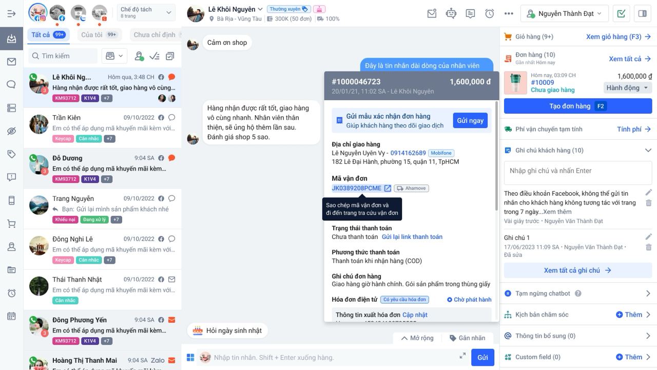 - Xem được trạng thái đơn hàng để tạo phản hồi cho khách ngay trong khi chat bằng cách đưa chuột vào hình ảnh sản phẩm trong hóa đơn.
