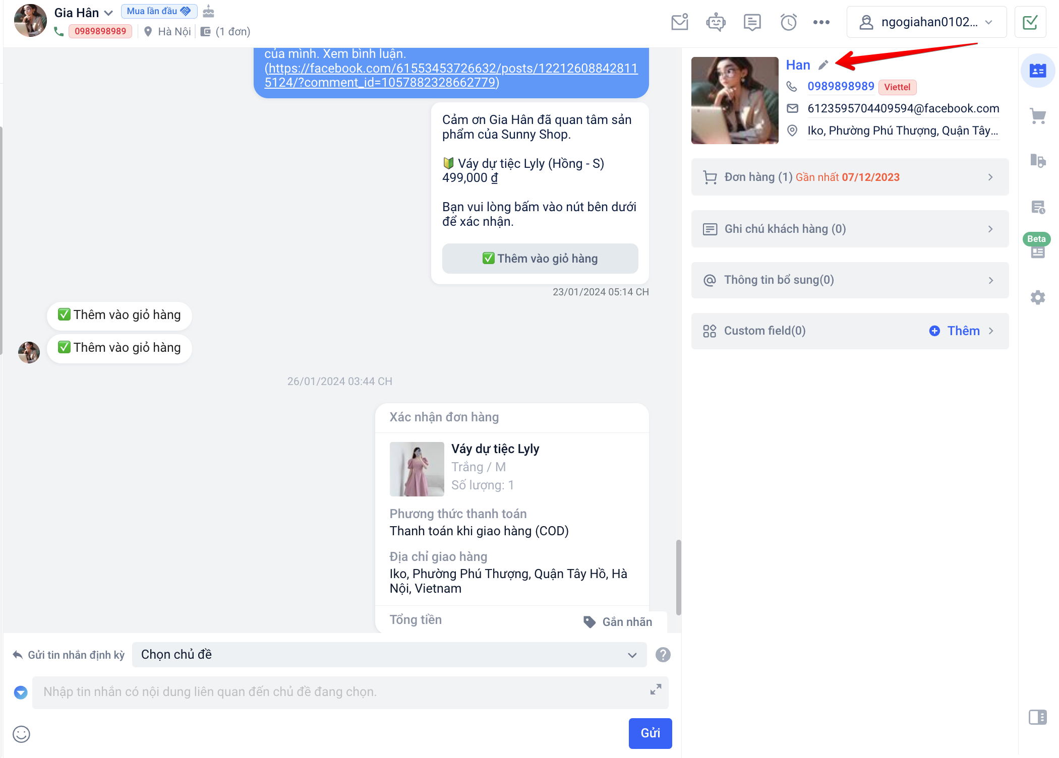 Bao gồm các thông tin cá nhân của khách hàng như: tên, email, địa chỉ, số điện thoại. Bạn có thể thay đổi thông tin của khách hàng bằng cách nhấp vào biểu tượng chỉnh sửa rồi cập nhật lại thông tin.