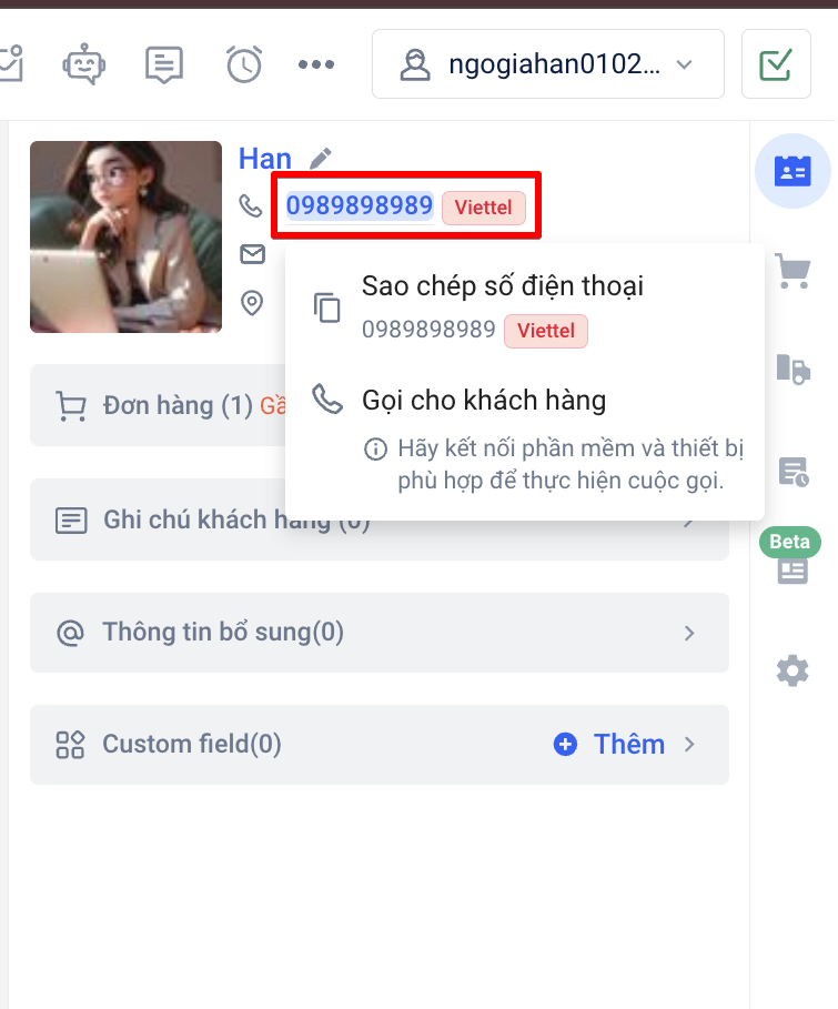 Tại số điện thoại của khách hàng, hệ thống sẽ hiển thị tên nhà mạng viễn thông dựa theo đầu số mặc định, không hỗ trợ trường hợp khách hàng đổi nhà mạng vẫn giữ số điện thoại cũ. Nhân viên có thể thao tác sao chép hoặc nhấn gọi cho khách hàng nếu máy của bạn có kết nối phần mềm và thiết bị phù hợp để thực hiện cuộc gọi.