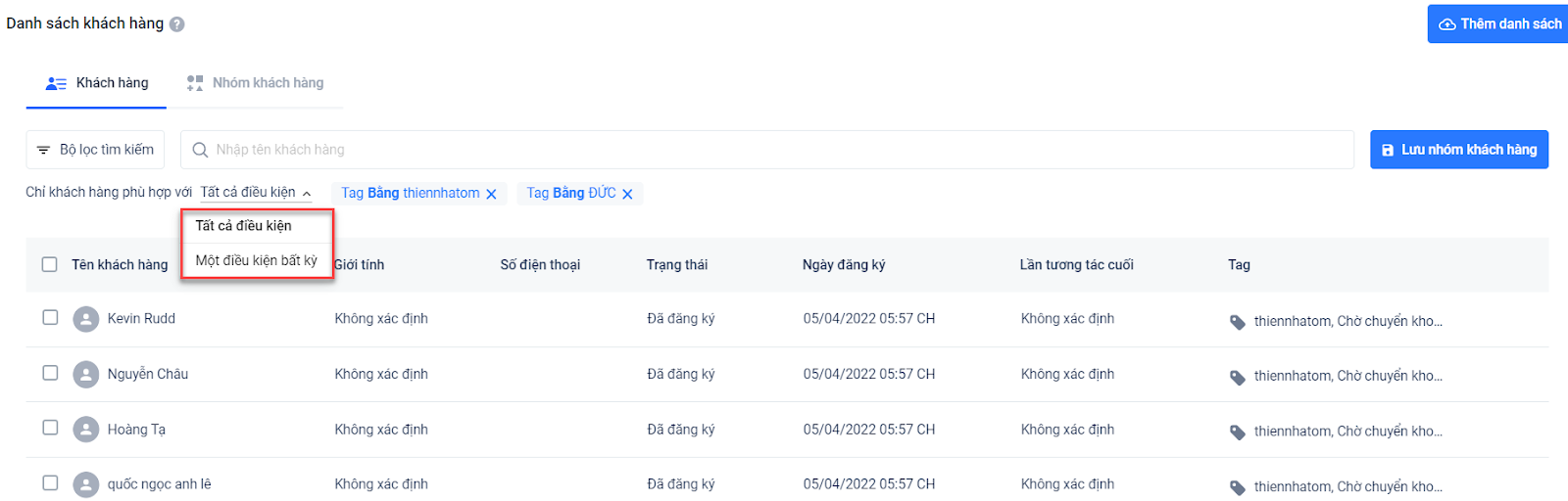 - Bất kỳ điều kiện nào: Khách hàng có chứa 1 trong tổng các điều kiện lọc sẽ được hiển thị.
