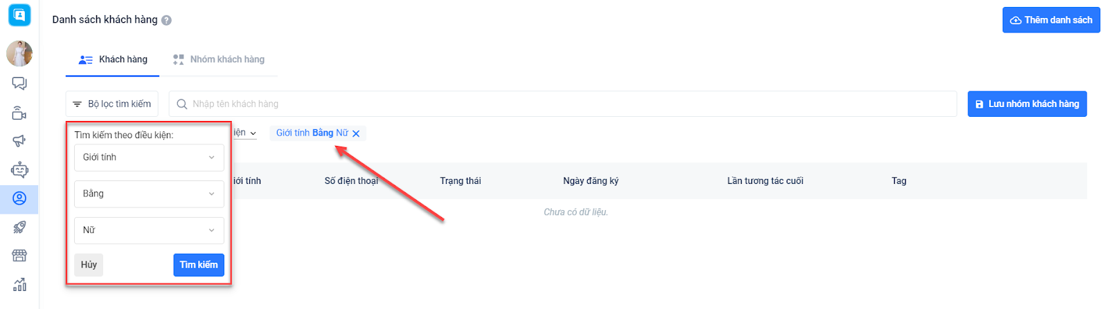 Ví dụ: Bạn lọc khách hàng theo custom field giới tính, có giá trị bằng Nữ, hệ thống sẽ hiển thị danh sách tất cả khách hàng có giới tính tương ứng.