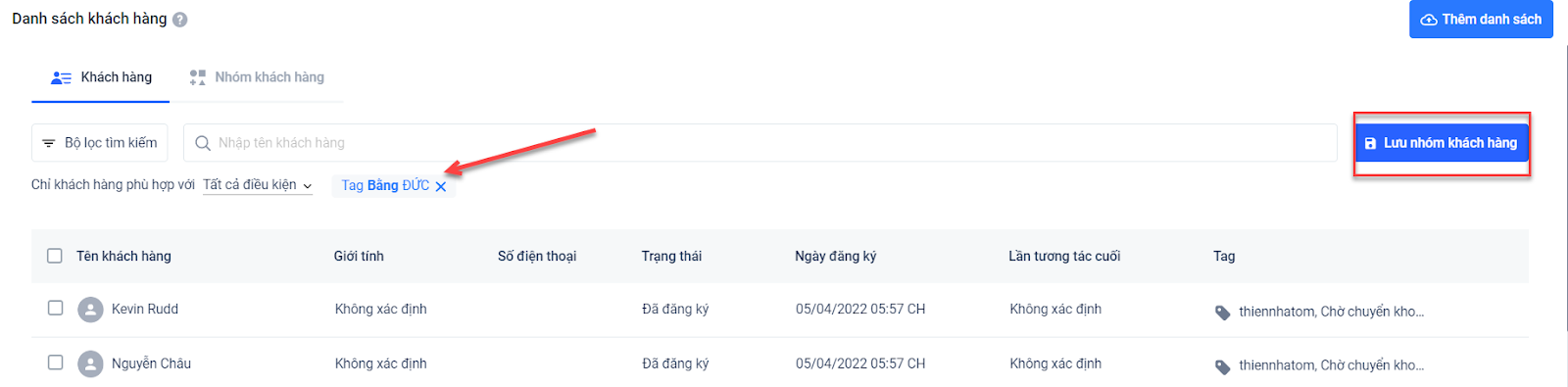 Sau khi lọc xong, bạn có thể lưu lại bộ lọc đó và tạo thành một nhóm khách hàng. Xem thêm về Danh sách Nhóm khách hàng.