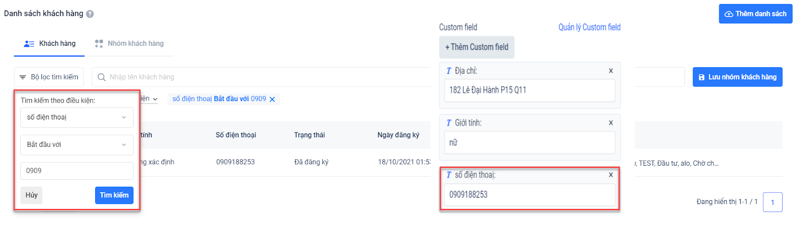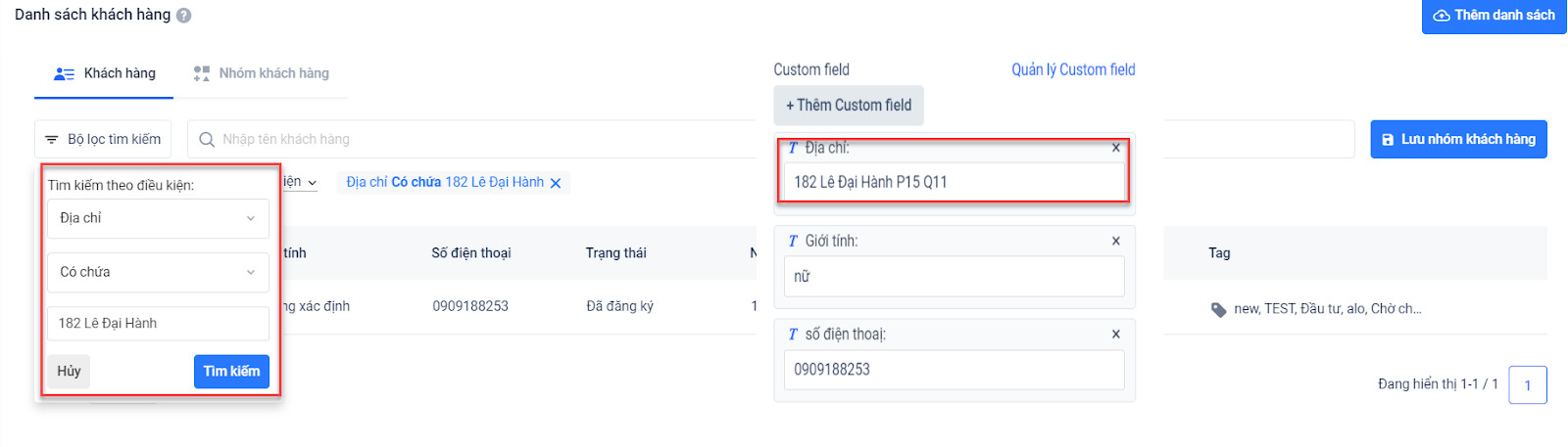 Ví dụ: Bạn muốn lọc khách hàng theo custom field địa chỉ, có giá trị là 182 Lê Đại Hành, bạn chỉ cần chọn lọc theo điều kiện có chứa 182. Hệ thống sẽ hiển thị tất cả khách hàng có custom field tương ứng.