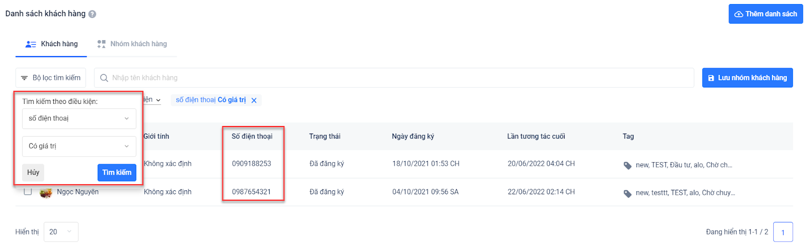 - Trường hợp bạn có 2 điều kiện lọc trở lên, hệ thống sẽ hiển thị thêm 1 bộ lọc nữa để tìm ra những khách hàng phù hợp hơn