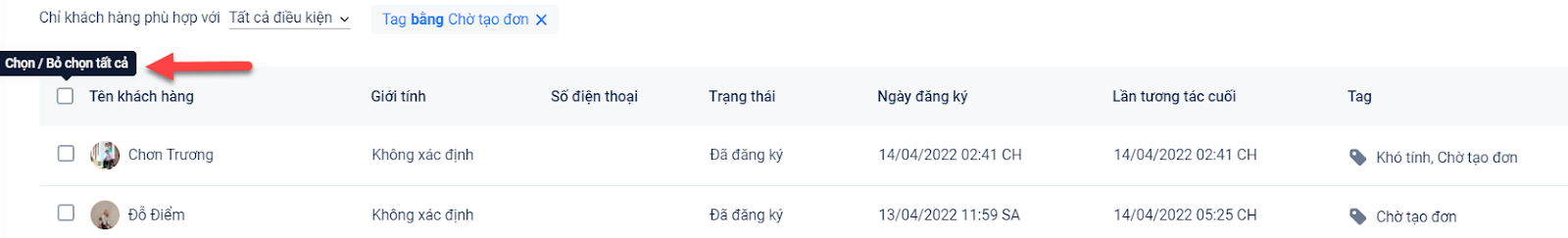- Bạn có thể lọc ra danh sách các khách hàng phù hợp với điều kiện cần có → Sau đó, bạn có thể lựa chọn tất cả hoặc những khách hàng mà bạn muốn bằng nút tick vào ô vuông.