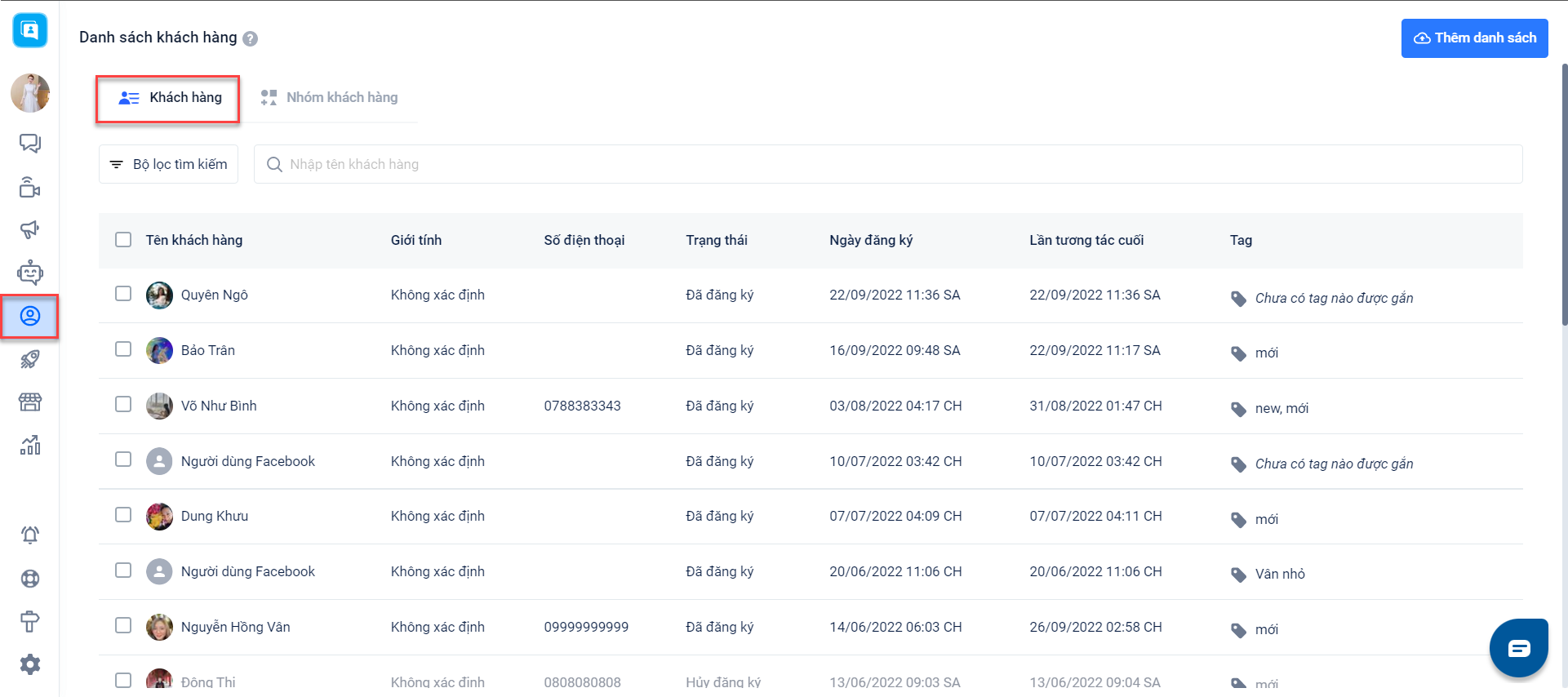 Danh sách khách hàng sẽ là nơi tập hợp đầy đủ các thông tin cá nhân của khách hàng. Tại danh sách khách hàng tại Harasocial bạn có thể dễ dàng quản lý và có các kế hoạch chăm sóc khách hàng phù hợp.