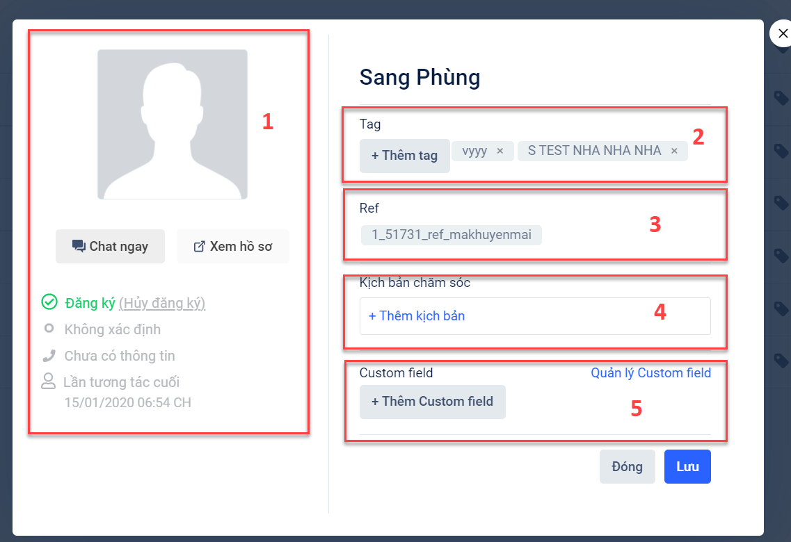 - Ảnh đại diện của khách hàng; trạng thái đăng ký và lần cuối cùng khách hàng tương tác với chatbot. Ngoài ra người bán còn có thể xem hồ sơ hoặc trò chuyện với khách bằng cách nhấn vào nút "Chat ngay" hoặc "Xem hồ sơ".