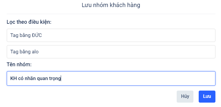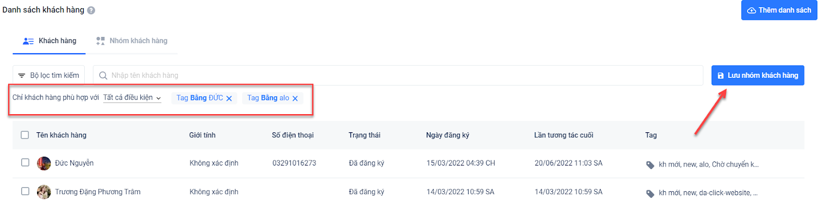 Sau khi đã lọc ra được các khách hàng thành nhóm thành 1 nhóm, bạn bấm “Lưu nhóm khách hàng” và đặt tên cho nhóm đó: