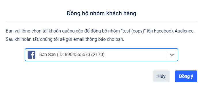 - Bước 2: Chọn tài khoản quảng cáo để đồng bộ danh sách này lên: