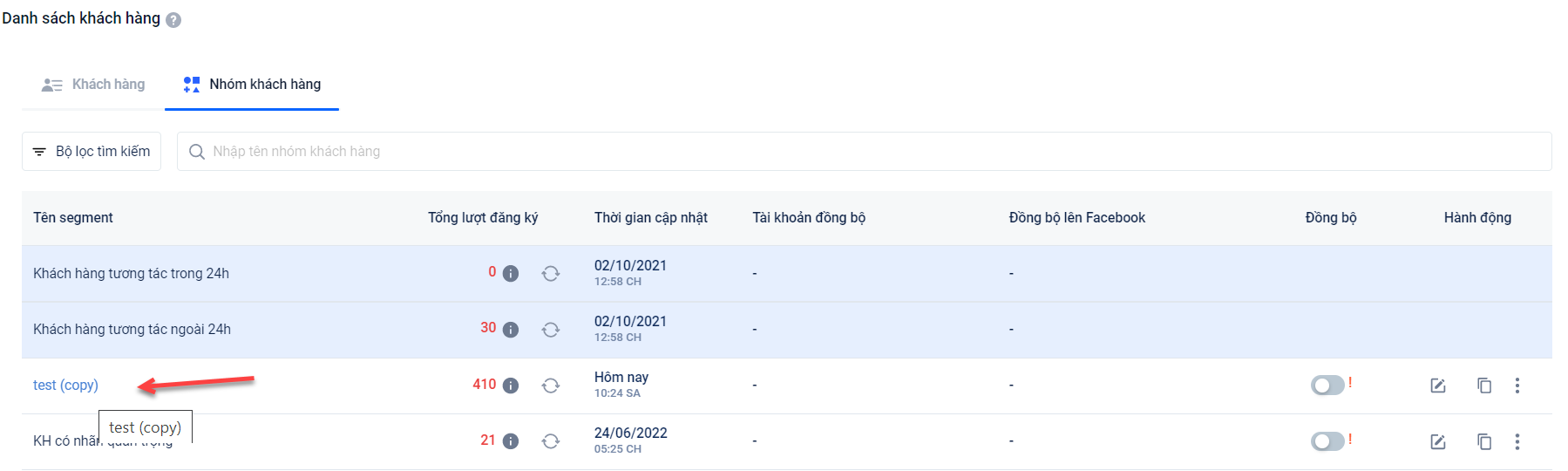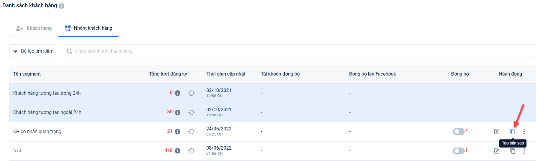 - Để tạo 1 bản sao cho nhóm khách hàng, bạn nhấp vào ký hiệu dưới đây. Điều này giúp bạn tiết kiệm được thời gian hơn vì khi bạn muốn thêm 1 điều kiện mới vào nhóm khách hàng hiện có, sẽ không cần phải tạo 1 bộ lọc lại từ đầu.
