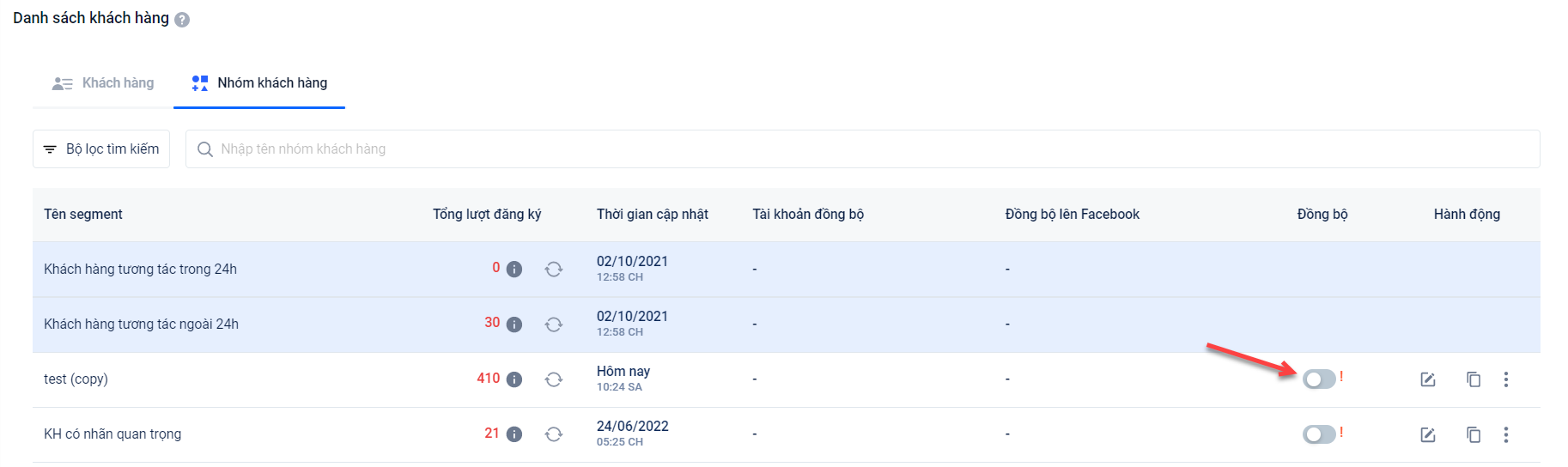 - Bước 1: Chọn nhóm khách hàng bạn muốn đồng bộ và nhấp vào nút gạt như bên dưới: