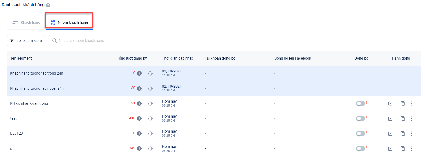 Mặc định hệ thống tạo sẵn giúp bạn 2 tập khách hàng là các khách hàng có tương tác trong và ngoài 24h.