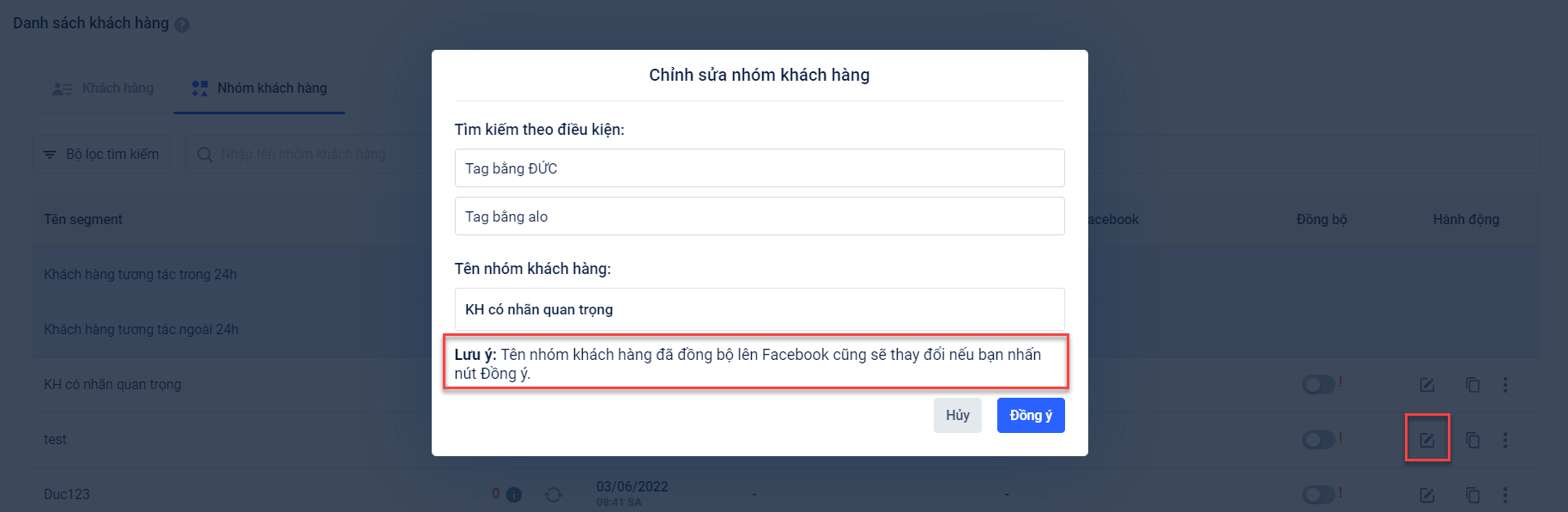 Bạn có thể chỉnh sửa nhóm bằng cách nhấp vào ký hiệu này. Lưu ý: Tên nhóm khách hàng đã đồng bộ lên Facebook cũng sẽ được thay đổi nếu bạn thay đổi tên nhóm khách hàng ở Harasocial.