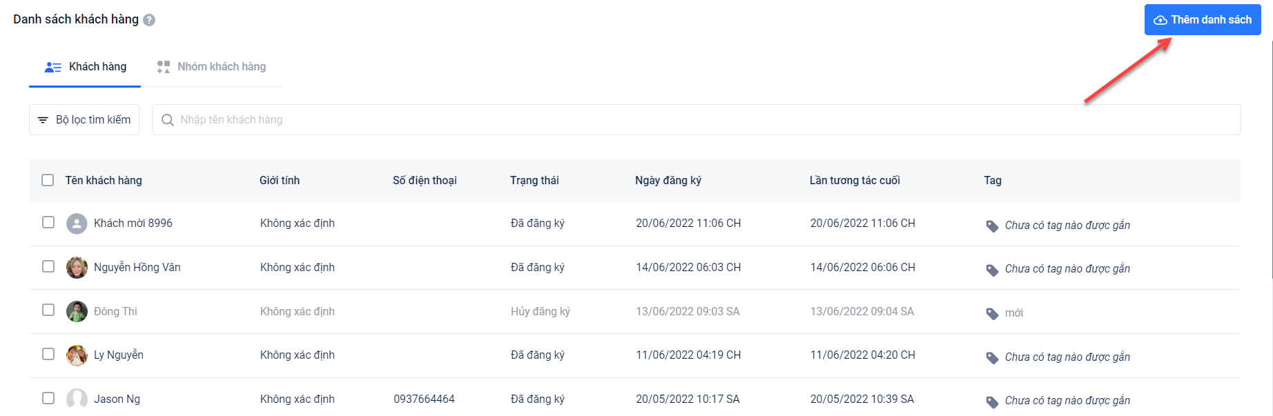Truy cập vào trang Harasocial → Chọn Khách hàng → Chọn Thêm danh sách.