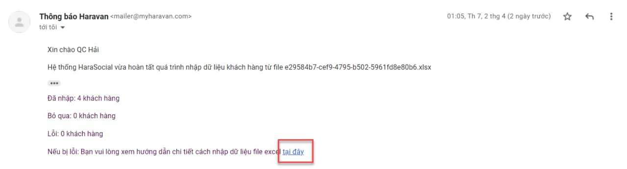 Sau khi đã tải lên hoàn tất, kết quả đồng bộ sẽ được báo về email của bạn với nội dung như sau: