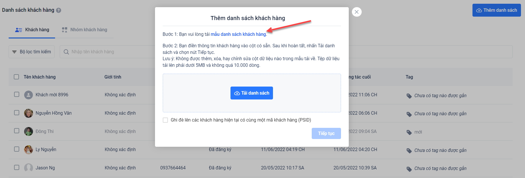 Tải dữ liệu mẫu về máy bằng cách nhấp vào “mẫu danh sách khách hàng”.