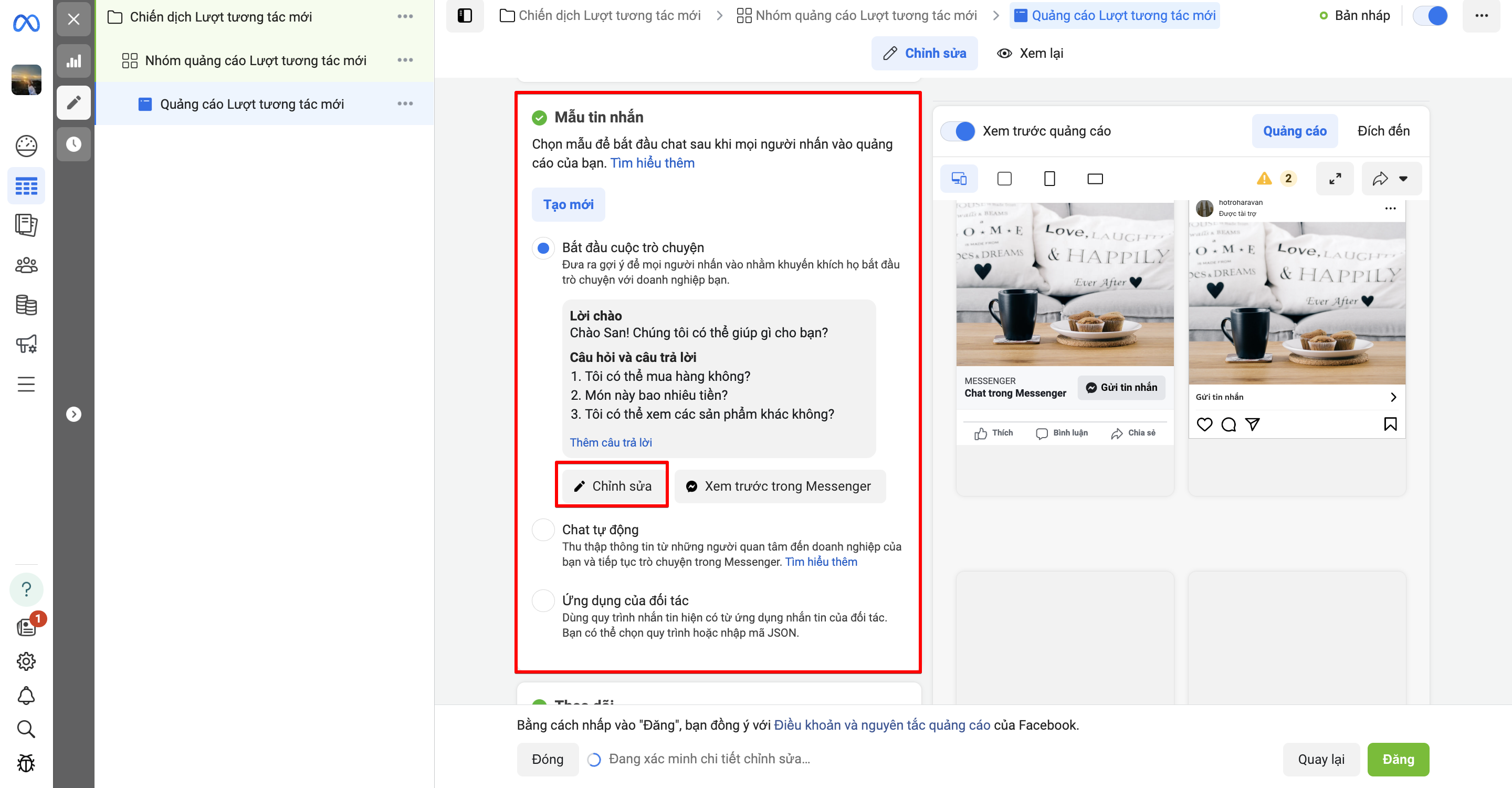 **Bước 2:**Tạo chiến dịch quảng cáo Click to Messenger có gắn link payload mua thêm